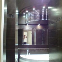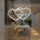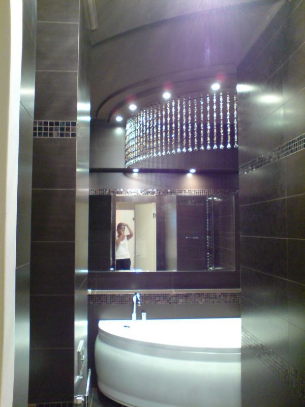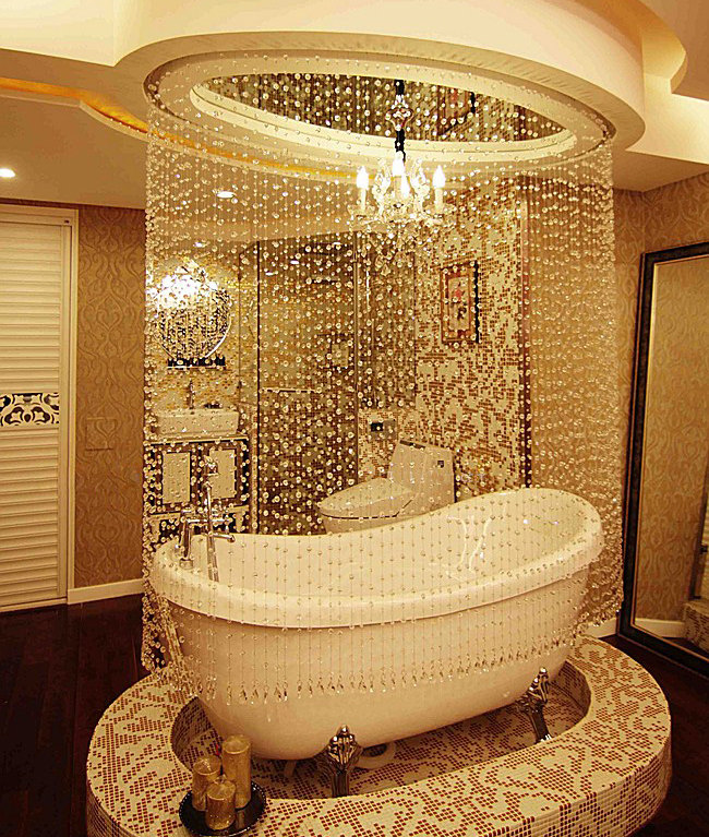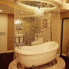 In einem modernen Badezimmer mit vernickelten Armaturen harmonieren Metallperlen gut. Ein raffinierteres Interieur wird durch Glasperlenstränge rund um das Bad ergänzt, die die Illusion von fließenden Tropfen darstellen.