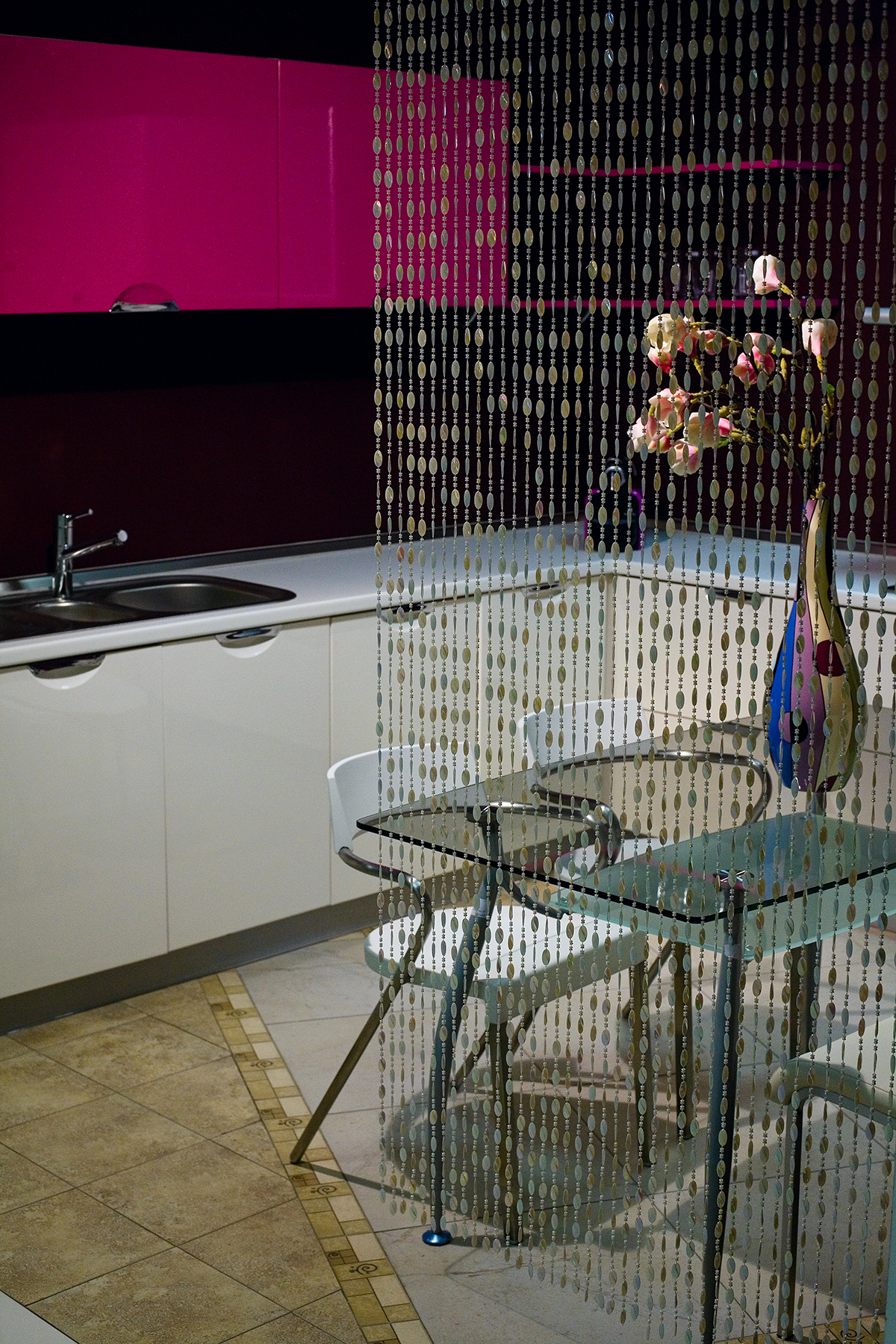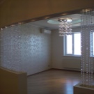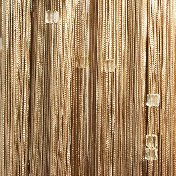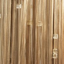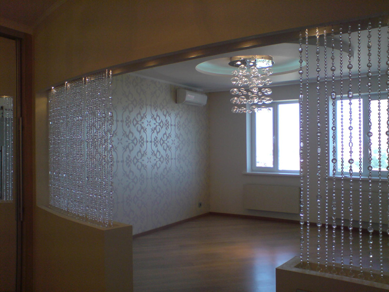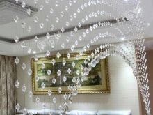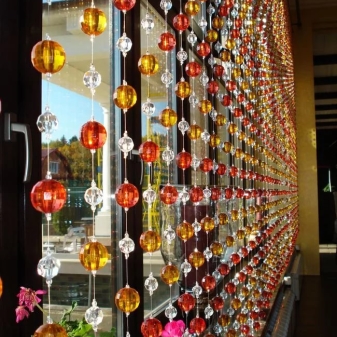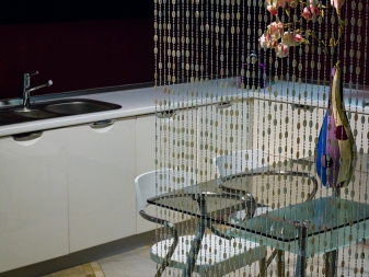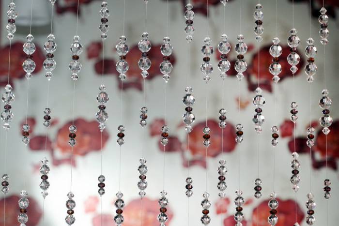 Die Perlen, die weit voneinander entfernt sind, zeigen anmutige Fäden, geben dem Raum mehr Luft und Licht. Interessanterweise verwendete Glas bei der Herstellung solcher Vorhänge spezielle Verarbeitung.Dick gesetzte Perlen erzeugen dickere Vorhänge, die als Bildschirm dienen können.
