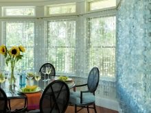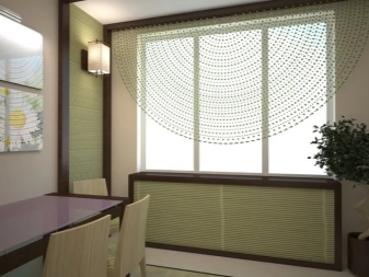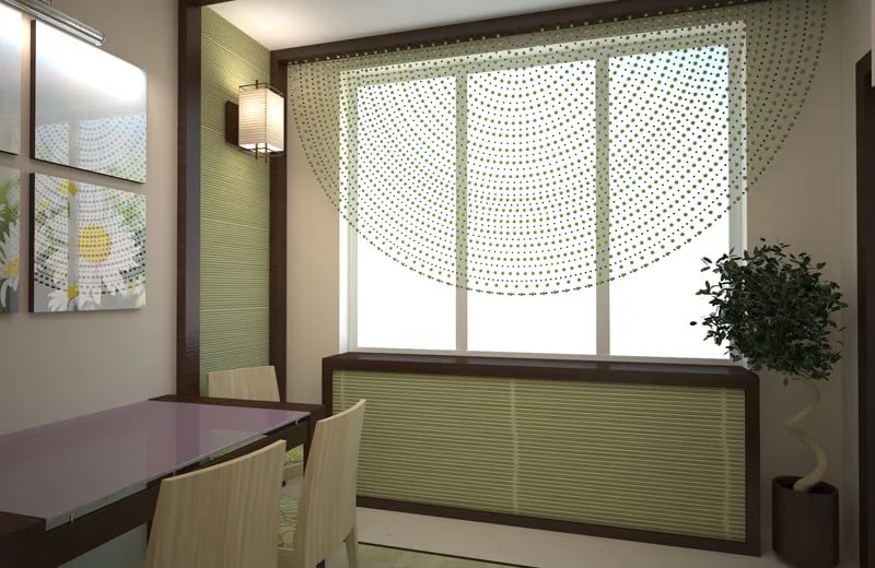 Eine breite Fensterbank, die als funktioneller Ruheplatz konzipiert ist, wird durch einen kurzen Perlenvorhang perfekt ergänzt. Sie stören nicht den Durchtritt von Sonnenlicht und verursachen kein Gefühl von "leeren" Fenstern.