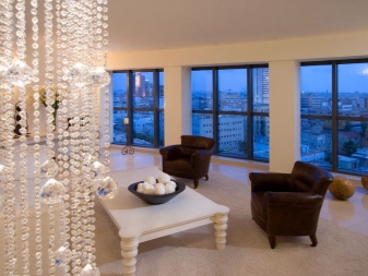 Geschmackvoll ausgewählte Perlenvorhänge harmonieren in jeder Stilrichtung des Interieurs. Damit die Fäden von zu leichten Perlen nicht mit einem leichten Luftzug überlappen, können Sie einen Draht durch die unteren Perlen ziehen und sie miteinander verbinden. Eine Alternative wäre, Gewichte hinzuzufügen - schwere Perlen.