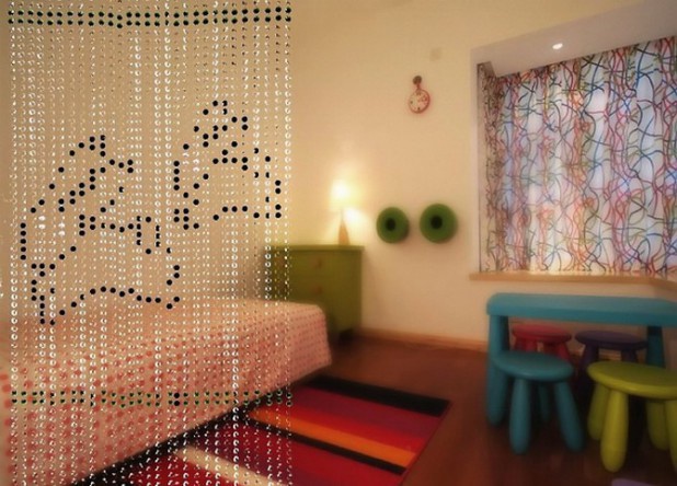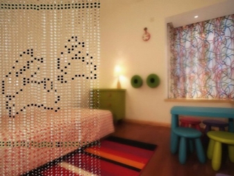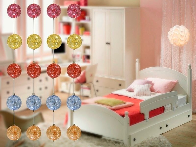 Für das Kinderzimmer werden meist schicke farbige Materialien verwendet, um die Aufmerksamkeit von Kindern auf sich zu ziehen. Die Perlen können in Form von Maschinen, Bällen oder Tieren vorliegen. Perlenvorhänge in der Gärtnerei teilen den Raum nicht nur in Funktionsbereiche, sondern dienen als originelle Dekoration.