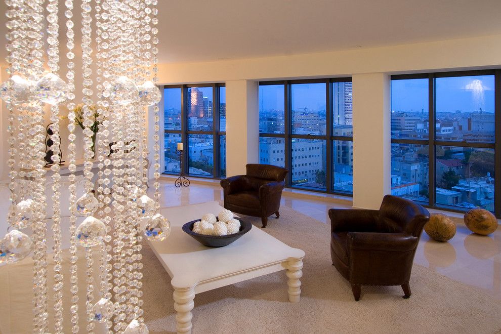 Die Verwendung von Kristallprodukten im Wohnzimmer gilt als ein echter Chic. Solche Vorhänge sehen reich und elegant aus und unterstreichen den guten Geschmack und das Gefühl für den Stil der Wohnungseigentümer. Die Verwendung solcher Vorhänge für Fenster, Nischen oder Bögen ist erlaubt. Produkte aus Perlmutt-Elementen wie zum Beispiel Kunstperlen werden in nüchternen Farben zum Highlight des Wohnzimmers.