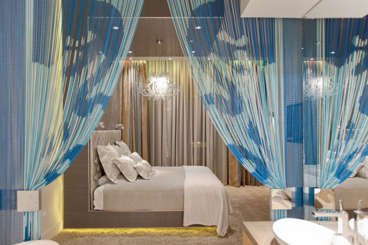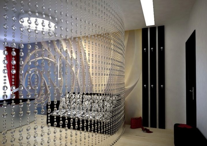 Bead Vorhänge sind eine effektive Option für die Zonierung einer kleinen Wohnung oder Teil eines Hauses der erfolglosen Planung. Neben der Dekoration von Fenstern und Türen können Vorhänge als Vorhang für ein Erkerfenster, ein Ankleidezimmer, eine Überdachung für ein Bett verwendet werden.