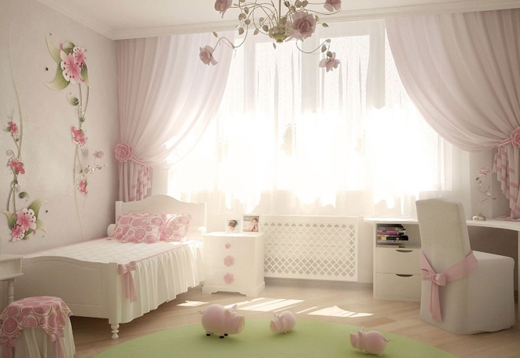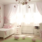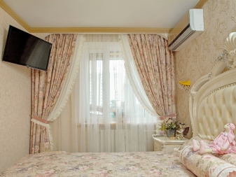 Die besten Farben sind verschiedene Schattierungen von Braun und Beige, Hellblau, Weiß, Pink und Burgunderrot.In diesem Fall können die Vorhänge als ein Schatten und vollständig in Bezug aufeinander kontrastiert sein.