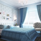 Klassische Vorhänge im Schlafzimmer können absolut jede Farbe haben. In diesem Fall lohnt es sich, darauf zu achten, dass die oberen Vorhänge in der Regel eine dunklere und kontrastreichere Farbe haben - im Verhältnis zu den unteren Vorhängen (die sich näher am Fenster befinden).