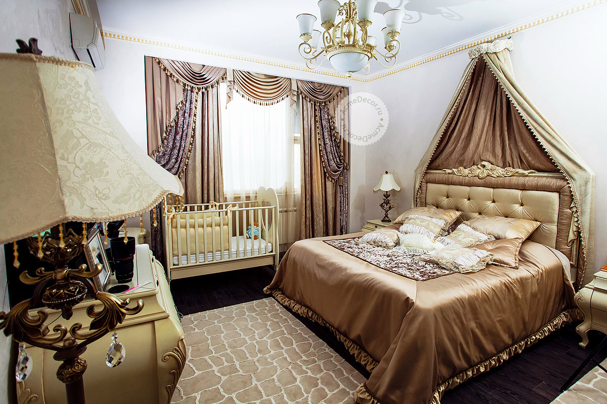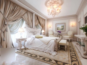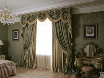- Barock. Es genügt, schwere Naturstoffe mit eleganten Vorhängen zu verwenden - die Vorhänge fügen sich perfekt in das gesamte Interieur ein.