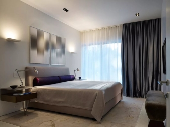 - Minimalismus. Klassische Vorhänge, die aus den einfachsten Materialien in beruhigenden Farben genäht werden und keine zusätzlichen Vorhänge haben, werden eine ideale Ergänzung zum Schlafzimmer in diesem Design sein.