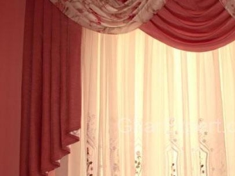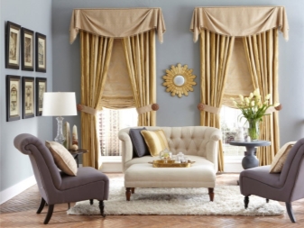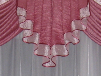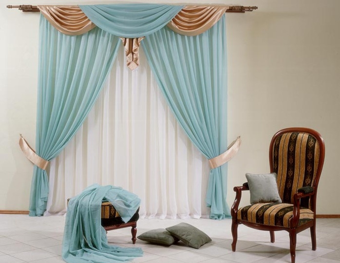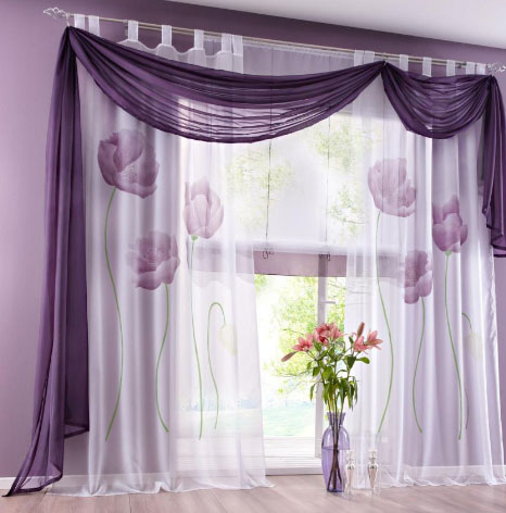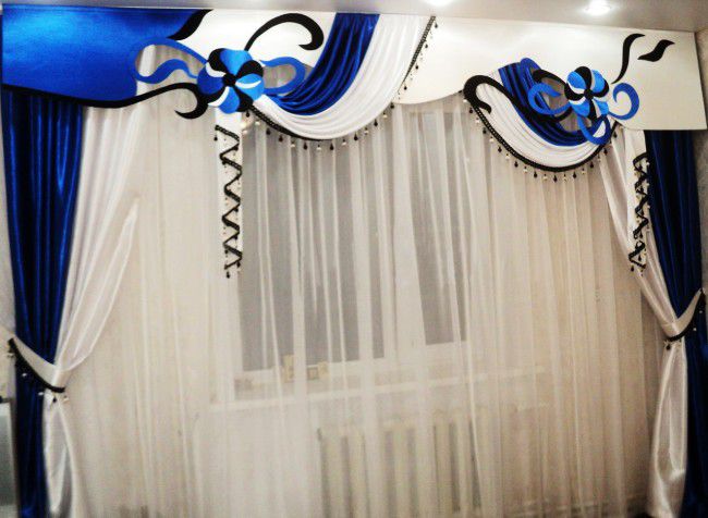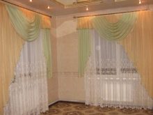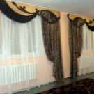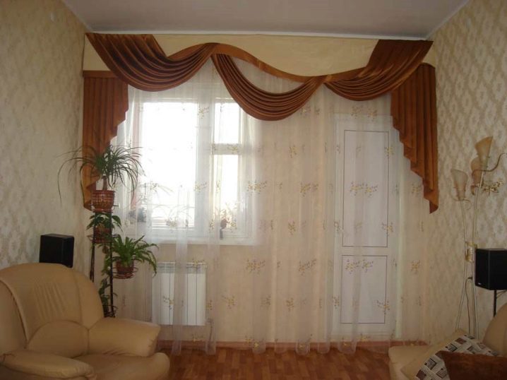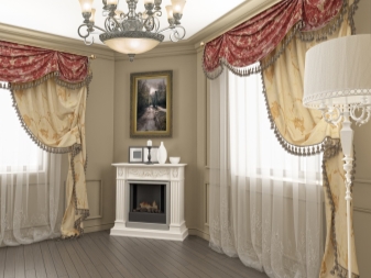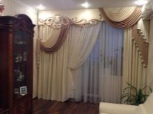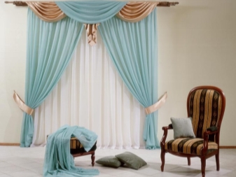 Leichte Lambrequins aus dem Schleier sehen in Räumen mit hohen Decken gut aus. Diese Regel kann jedoch umgangen werden, indem leichte Stoffe mit schwereren Vorhängen kombiniert werden. In der Einstellung des Wohnzimmers ist in der Regel willkommen, wenn der Rahmen aus Stoffen kontrastierenden Farbtönen geschaffen wird.