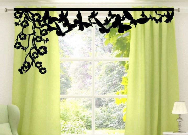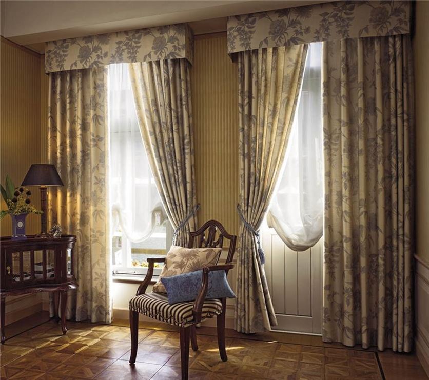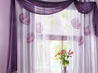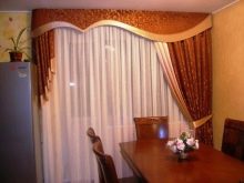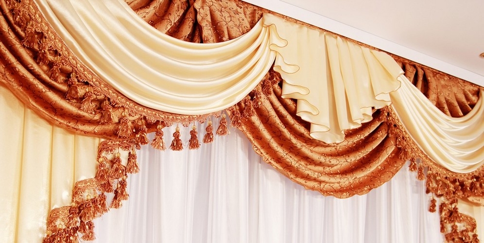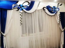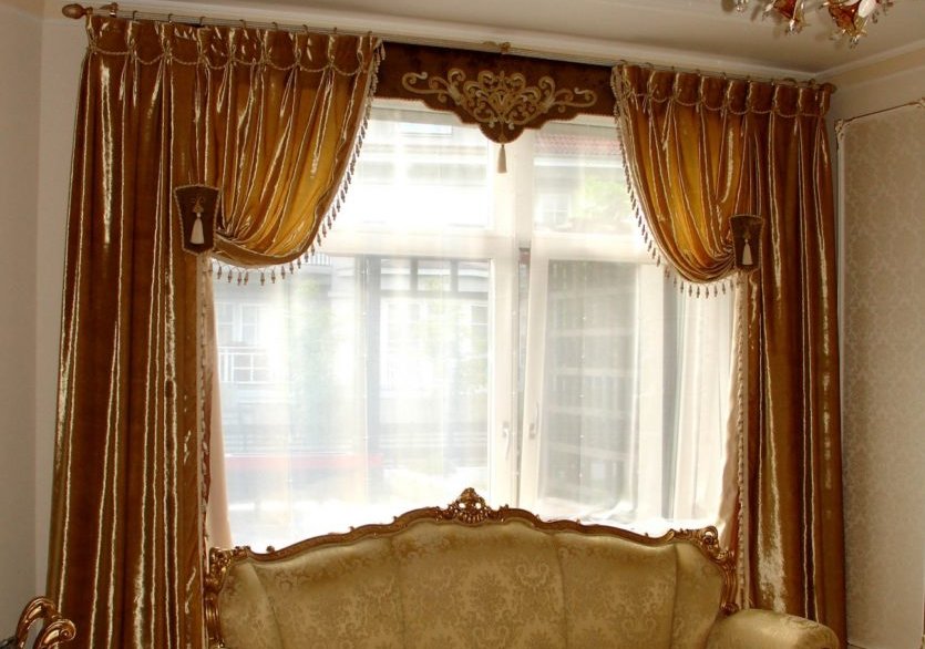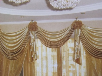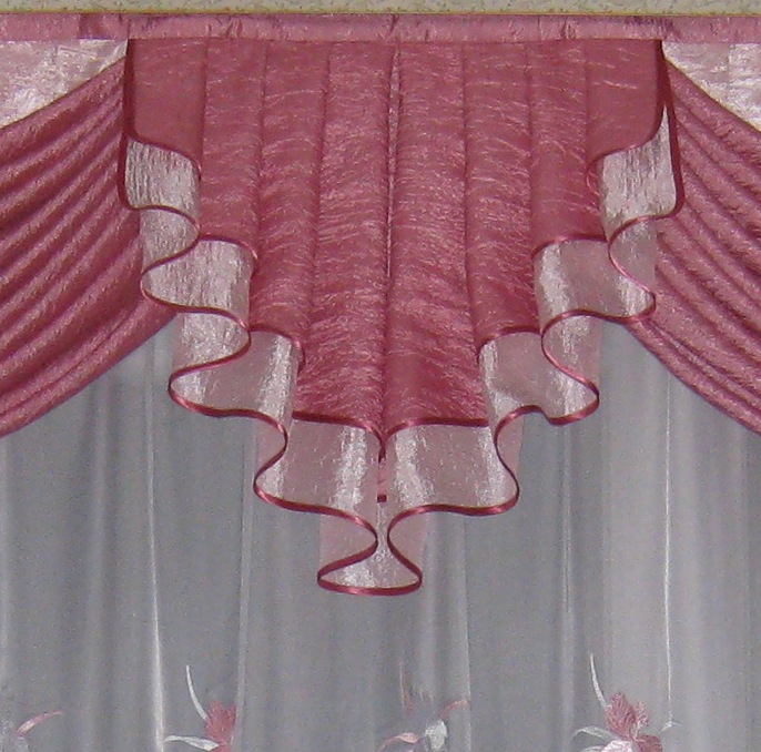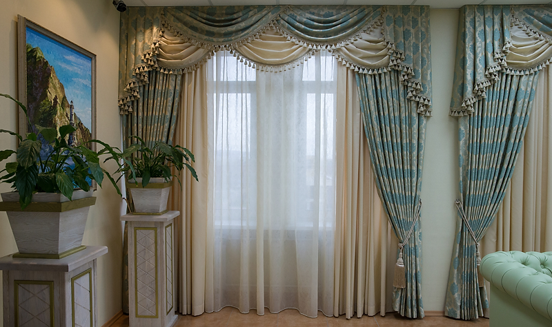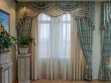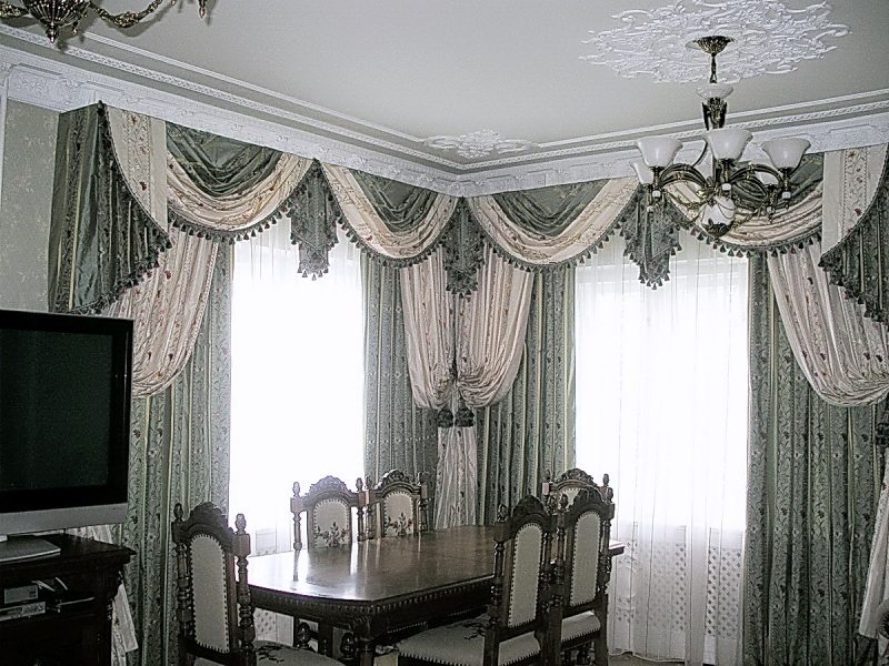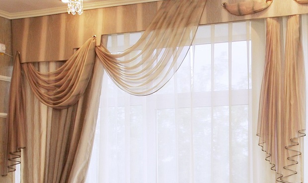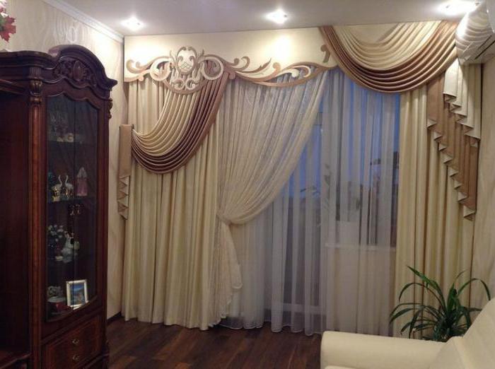 Bei der Auswahl von Stoffen für weiche Lambrequins sollten Sie sich an den Stil des Raumes halten. Es ist notwendig, die Wahl der Vorhänge zu berücksichtigen.