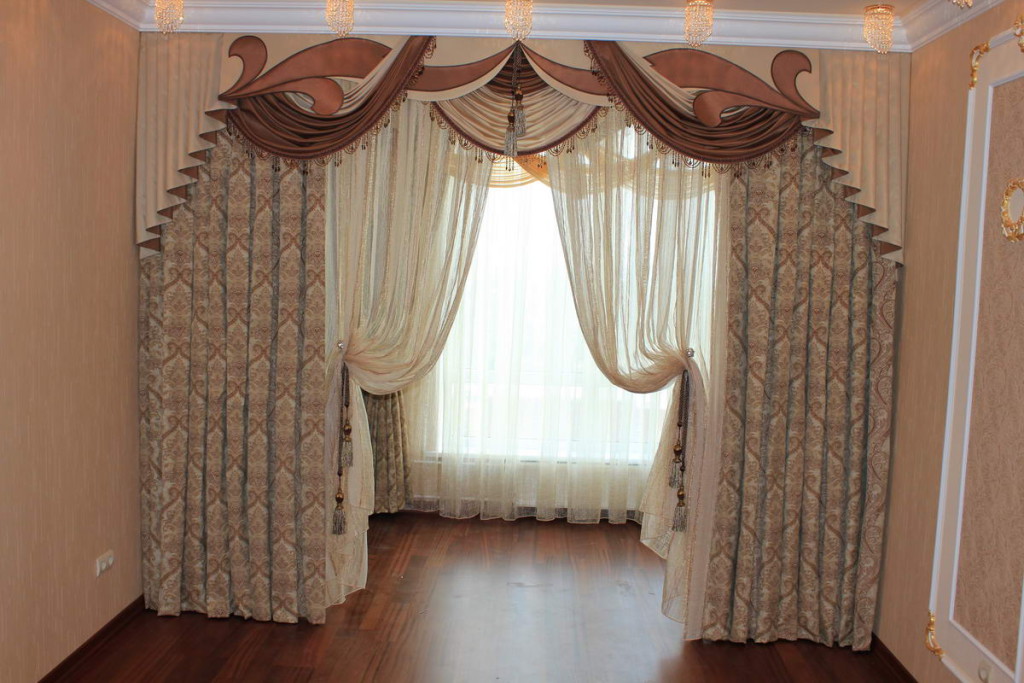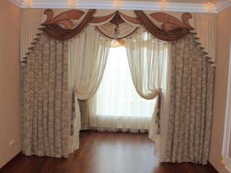 Die kombinierten Lambrequins sind die weichen und starren Details, die zusammen gesammelt werden. Diese Option ist die pompöseste von allen. Er wird normalerweise ausgewählt, um das Fenster im Wohnzimmer zu gestalten, aber hier ist Vorsicht geboten. Solch ein Lambrequin kann nur von einem Fachmann entworfen werden, da ein Amateur, der nicht genügend künstlerischen Geschmack hat, höchstwahrscheinlich enttäuscht sein wird, indem er sein eigenes Modell erstellt. Professionelle Designer wissen, welche Elemente miteinander kombiniert werden sollten und welche nicht.