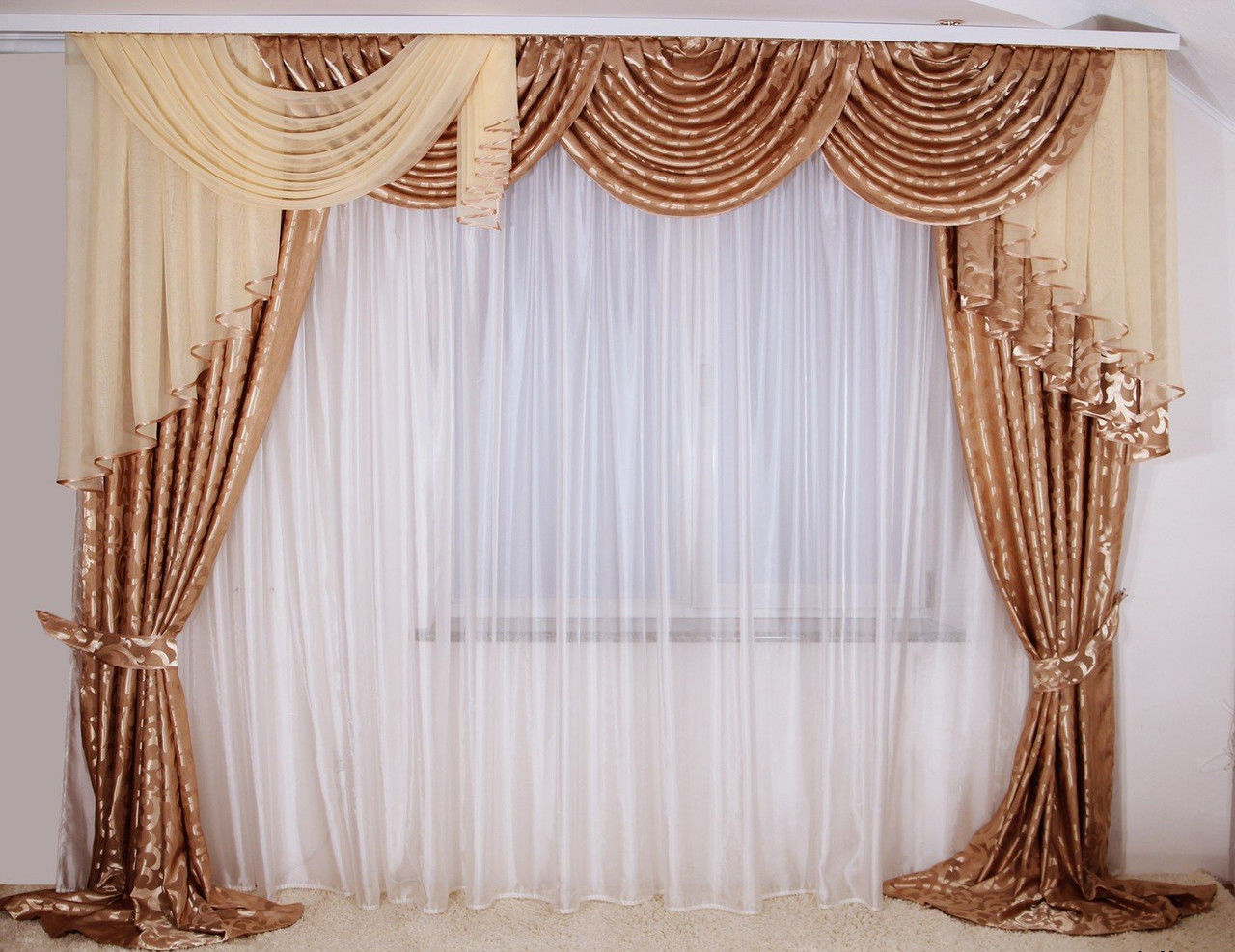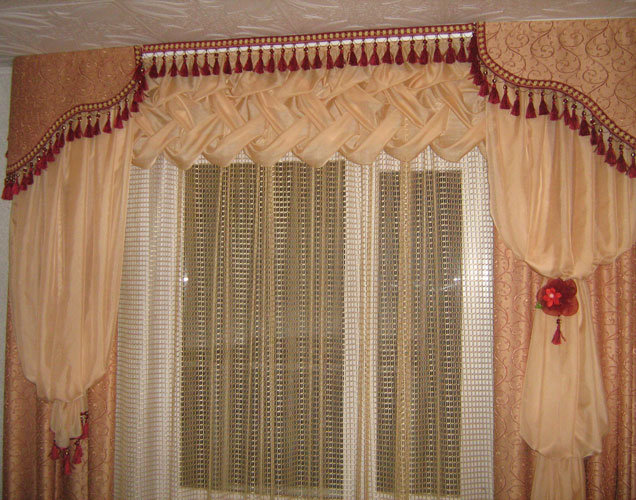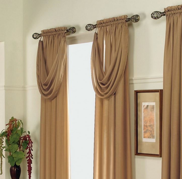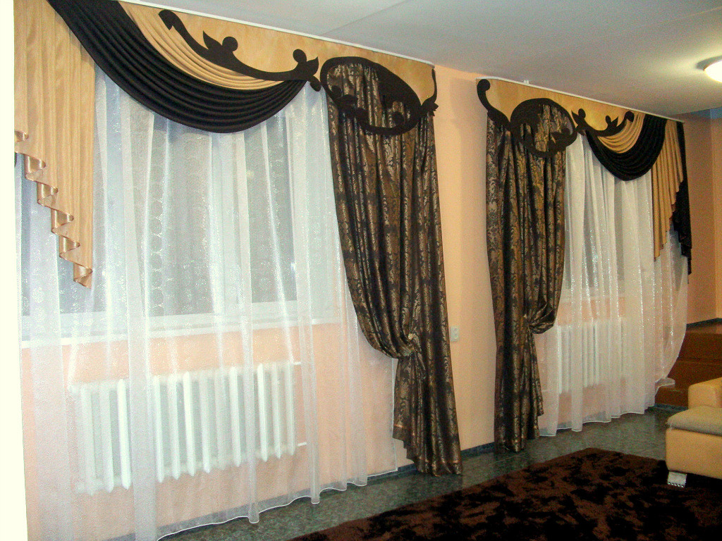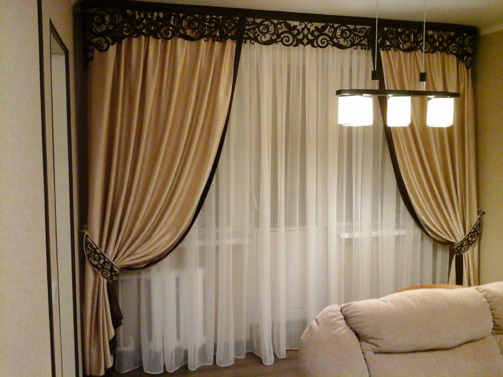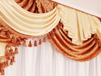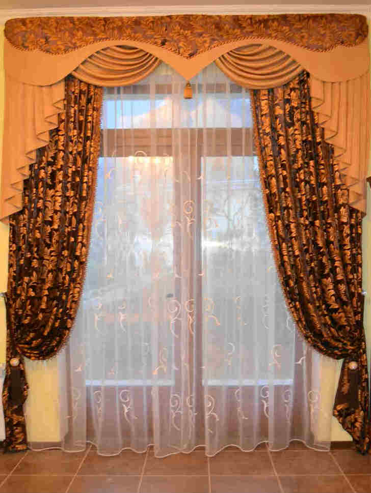 Ein gutes Beispiel wäre eine Kombination aus hellbeigem Tüll und dunklem Schokoladenbrokat. Es scheint, dass der Ton derselbe ist, aber diese Schattierungen sehen wie Kontraste aus, aufgrund dessen das ganze Design des Lambrequins interessanter scheint.