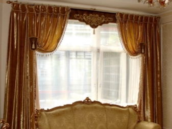 Hier ist ein Beispiel für eine modische kombinierte Ecke Lambrequin. Die Wahl der Goldfarben erlaubt es, dem Raum ein luxuriöses Aussehen zu geben, während der weiße Rand einer harten Bande unter der Farbe der Decke das Element leicht ausbalanciert, wodurch es weniger pingelig wird, aber seinen festlichen Look nicht verliert.