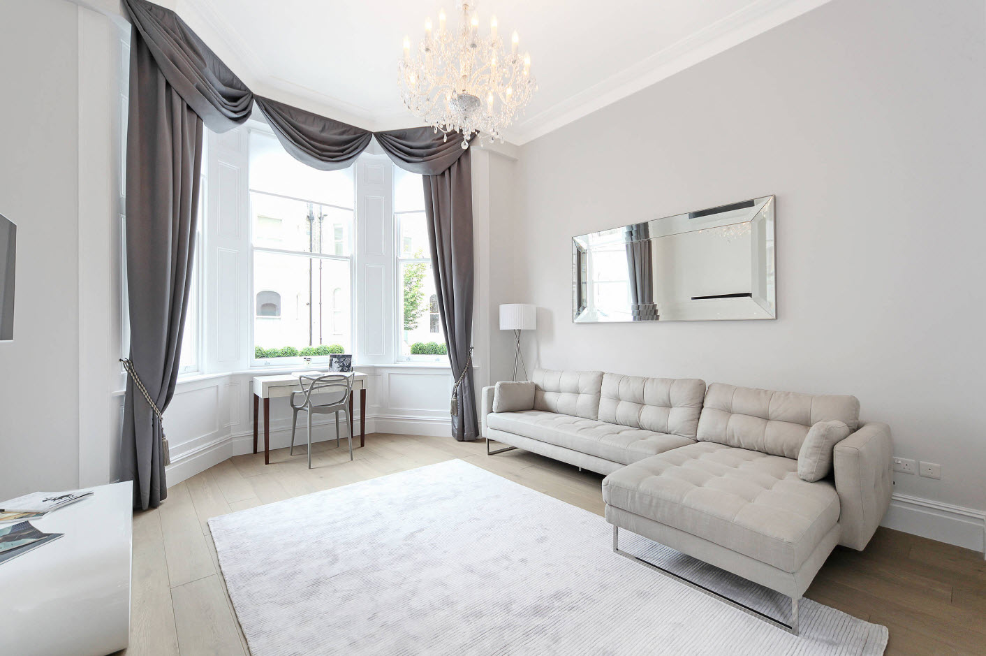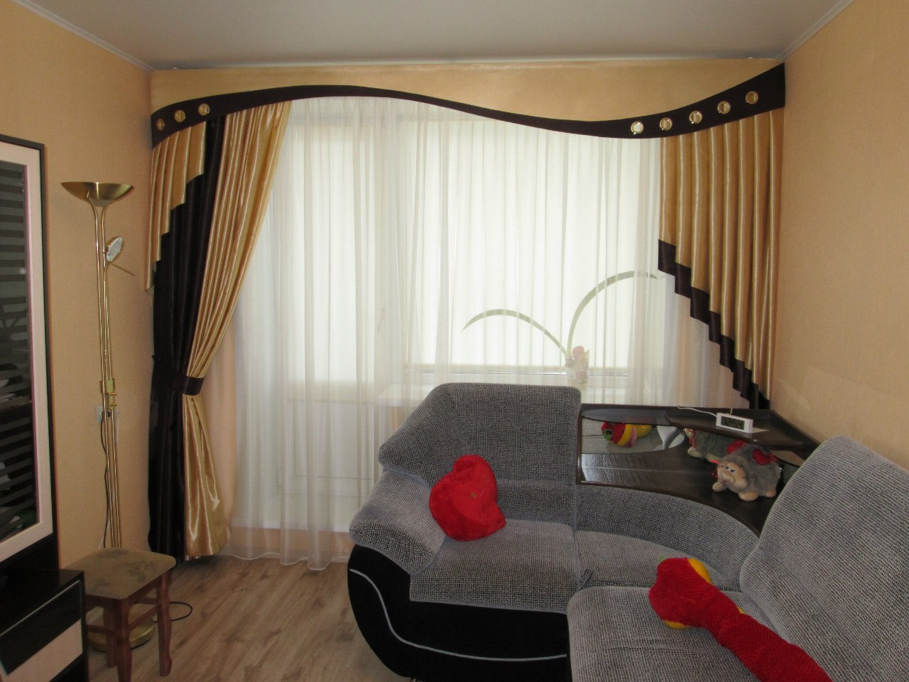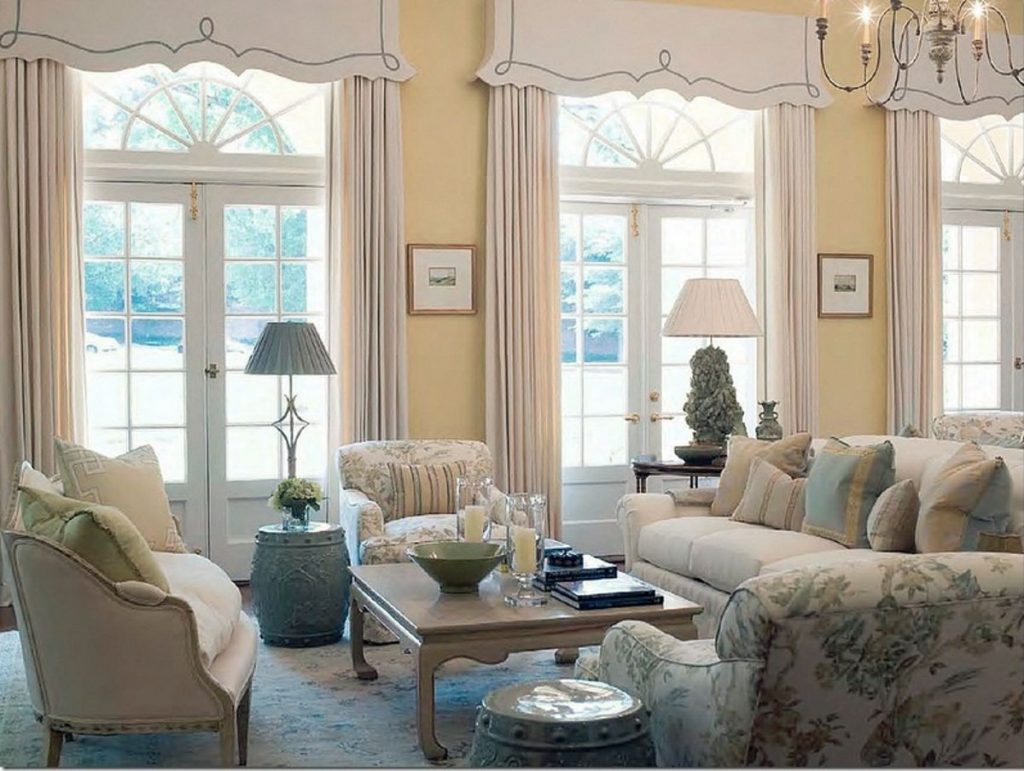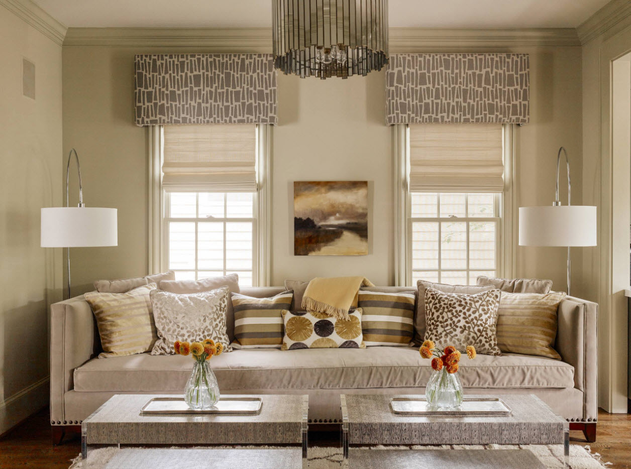Bei der Wahl einer Farblösung für Lambrequins im Wohnzimmer ist es nicht verboten helle satte Farben wie Rosenrot, Smaragd, Tiefblau, Pfirsich, Hellgrün zu verwenden. Doch gedämpfte zarte Töne bleiben in der ersten Saison in Mode. Grau, Flieder, Weiß, Beige, Hellgrün oder Blau unterstreichen die Schönheit des Raumes nicht weniger als auffällige Farben und erlauben Ihnen, auf etwas anderes, zum Beispiel auf einem schönen Sofa, besonderen Wert zu legen.