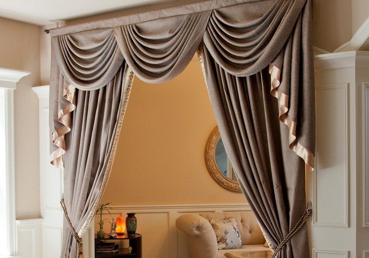 Stilvolle Lambrequins können nicht nur zum Fensterrahmen verwendet werden. Dieses Foto zeigt deutlich, wie Sie Vorhänge mit Svagami und Jabobs verwenden können, um den Raum eines Raumes zu begrenzen. Lambrequins aus dickem Leinenstoff werden durch ein dezentes Dekor in Form eines Seidenbandes in zarter Farbe ergänzt.Sie passen perfekt in ein klassisches Interieur.