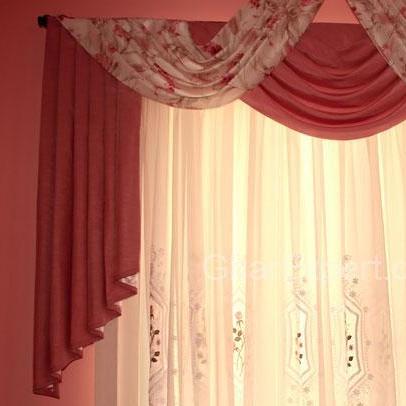 - Das am häufigsten verwendete Element ist Swag. Sie sind bogenförmige halbkreisförmige Anordnungen unterschiedlicher Breite und Tiefe, abhängig von ihrer Position auf der Traufe. Sie können oft Kombinationen von unterschiedlich großen Svag in einer Komposition finden. Sie sind aus transluzentem Chiffonstoff und Vorhangstoff gefertigt und können miteinander kombiniert werden.