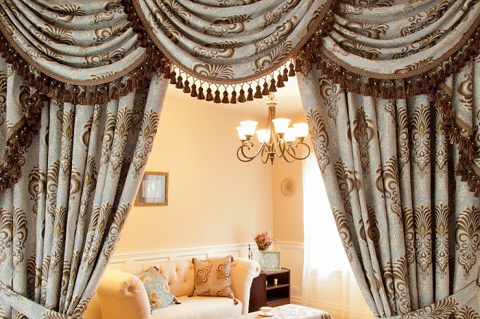 - Bei der Wahl der Finishs für Lambrequins, achten Sie auf goldene Farbe Vergoldete Fransen passen zu fast jedem Stil und verleihen dem Raum Eleganz