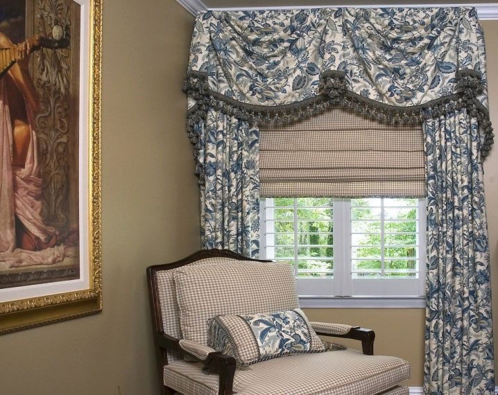 Modische Lambrequins mit floralen Ornamenten werden im Duett mit römischen Mattenvorhängen hergestellt. Sie sehen stilvoll und gleichzeitig zu Hause aus. Achten Sie darauf, wie gut die Textilien ausgewählt sind: Das Kissen des Stuhls besteht aus dem gleichen Material wie die Pelze und ist an den Seiten mit den gleichen Fransen flankiert.