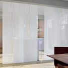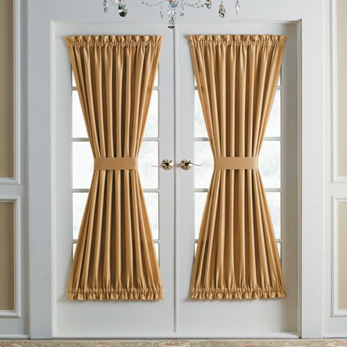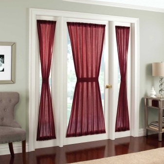 Für Glastüren werden einfache Vorhänge verwendet. Sie können dieselbe Option kaufen, die Sie in Ihrem Fenster ausgewählt haben. Es wird gut aussehen Modell "Sanduhr". Es ist ein Vorhang mit oben und unten entlang der gesamten Länge befestigt. Die Mitte ist in Falten gerafft und mit Hilfe von Kleben gesichert. Achte auch auf die Rollen- und Römerversionen.