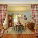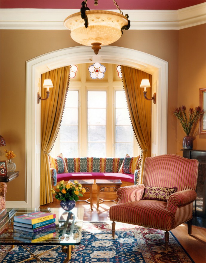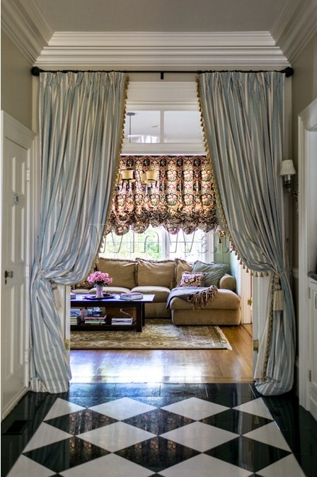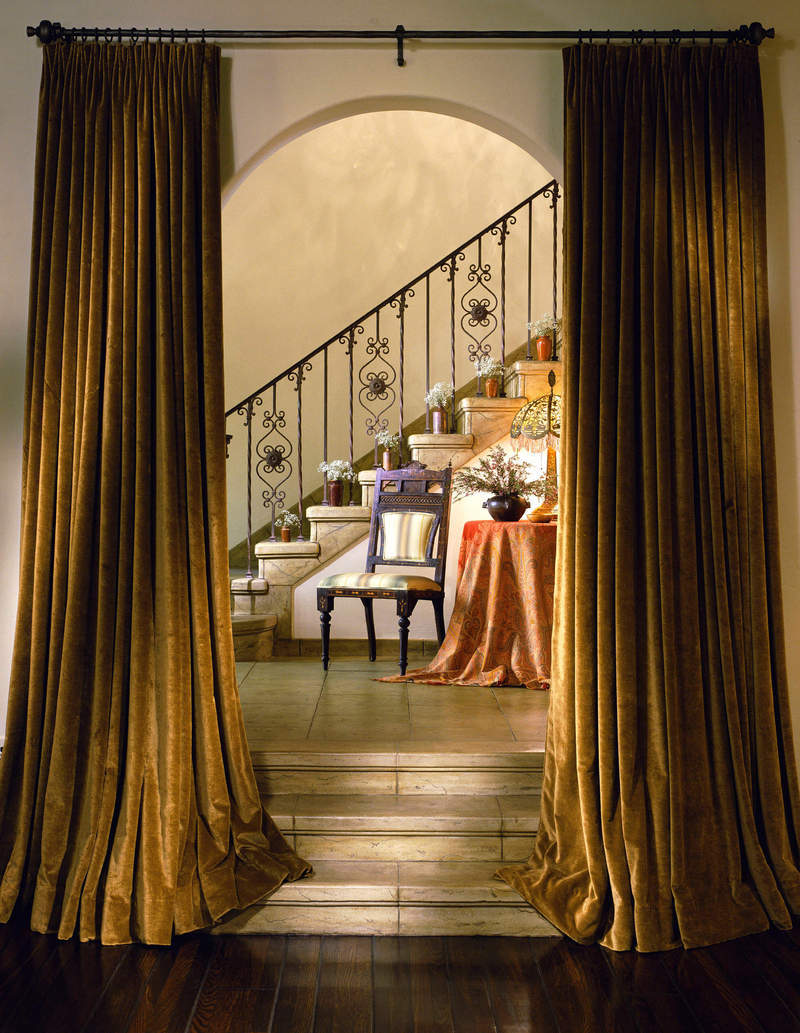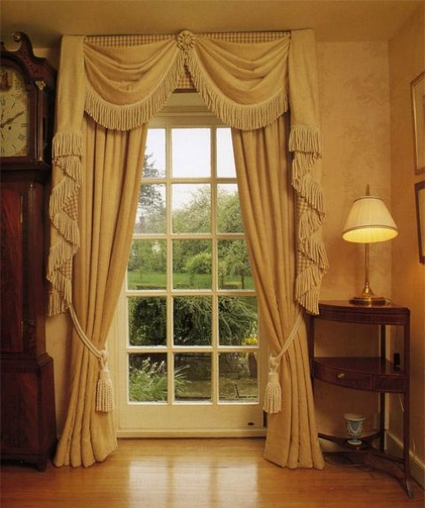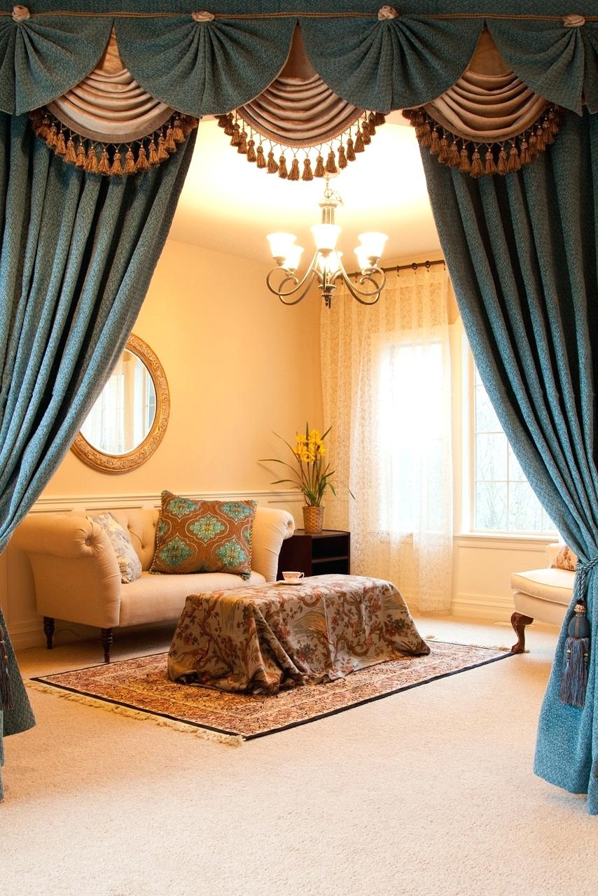 Klassisches Vintage-Interieur kann Textil- oder Korbvorhänge ergänzen. Werfen Sie einen Blick auf den luxuriösen Stoff mit Fransen, Falten und Quasten in satten Farben.