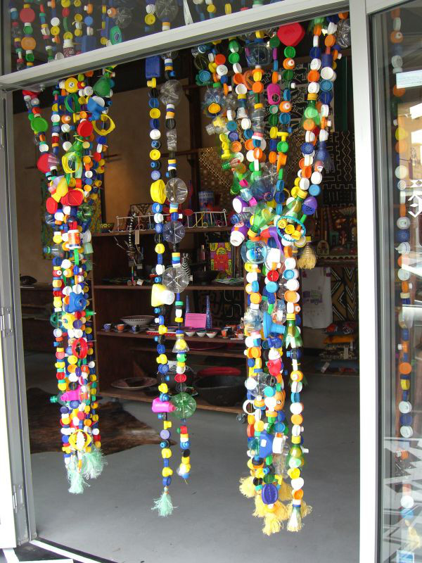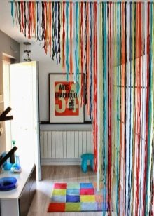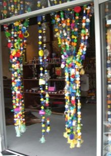 Außerdem können die Vorhänge an der Tür aus Abfallmaterialien hergestellt werden: Papier, Plastikkappen, Pappe und sogar Verpackungen.