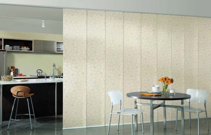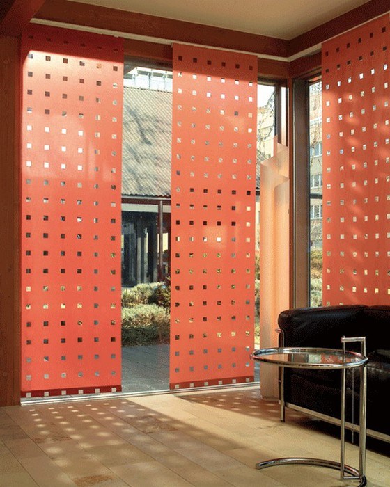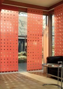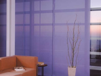 Gegenwärtig kann die Vorhangfassade eine große Auswahl haben. Je nach Ihren Vorlieben können Sie vertikale Strukturen auswählen, die bis zum Boden reichen und beim Zoning des Raums helfen. Es gibt horizontale Vorhänge, die eine gerade Leinwand sind und Falten sammeln.