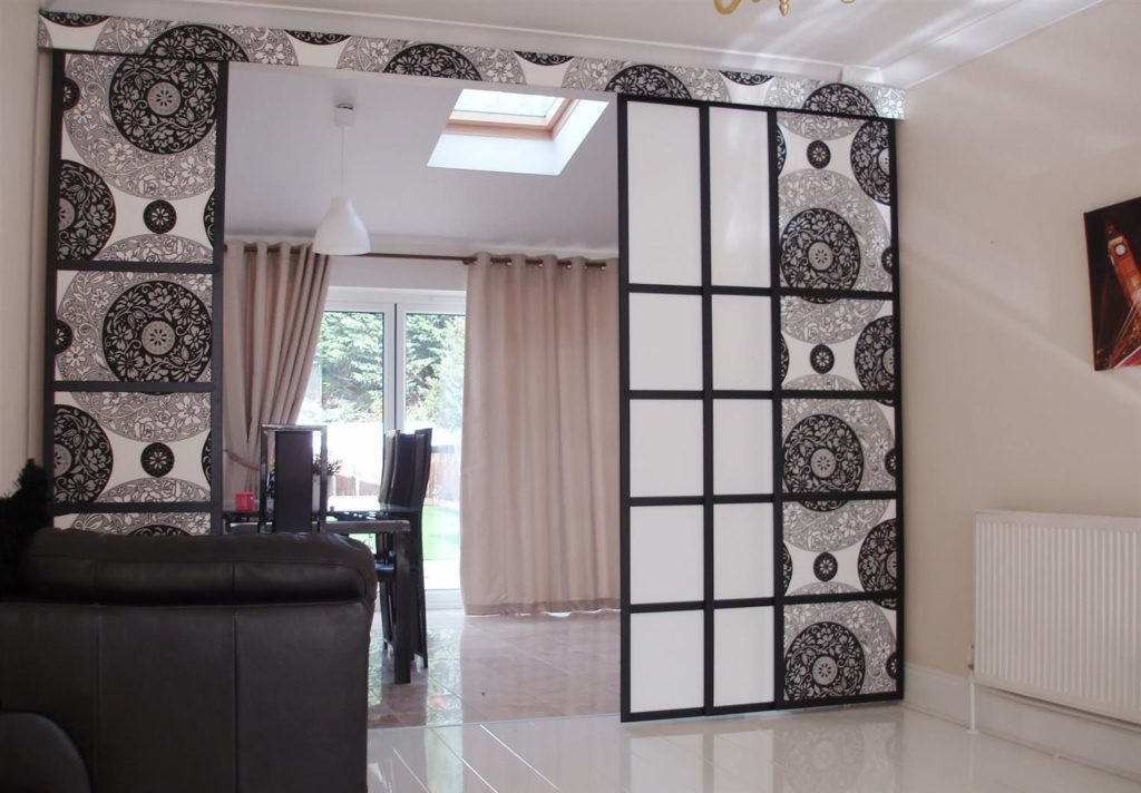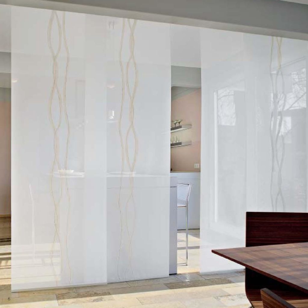 Japanische Vorhänge sehen in breiten Türen gut aus. Wenn die Innentür eine Standardgröße hat, "verdreht" der schmale Flügel den Raum in einen Aufzug.