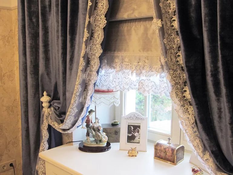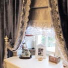 Wenn Sie dem Design eine gewisse Eigenart und Individualität verleihen möchten, können Textilien mit Lambrequins ergänzt werden. Diese Details schaffen im Interieur immer einen besonderen Reiz. Bänder und andere ähnliche dekorative Elemente werden dazu beitragen, die Umgebung spielerischer zu gestalten.