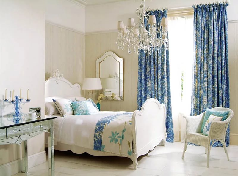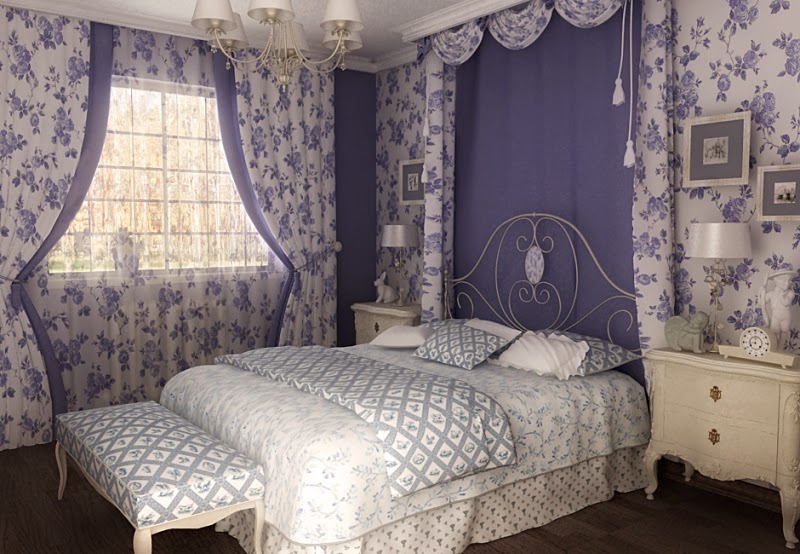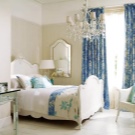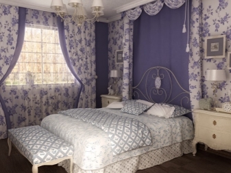 Eines der beliebtesten Reiseziele ist Provence. Das Schlafzimmer in diesem Design sieht äußerst sanft und komfortabel aus. Zur Dekoration von Fenstern werden Doppelvorhänge verwendet. Für diesen Stil sind ausgewählte Produkte mit einer dichten Textur, in einer dunklen Farbe gemacht. Blumendrucke und -muster sind zu bevorzugen.