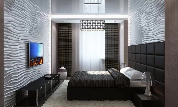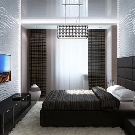 Für heute ist der beliebteste Trend in dieser Gruppe High-Tech Wie oben erwähnt, kann das Schlafzimmer mit metallischen Textilien ergänzt werden. Eine gute Lösung wäre, römische Farbtöne in neutralen Farbtönen zu verwenden.