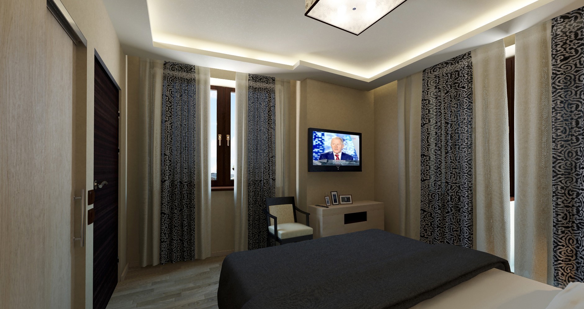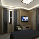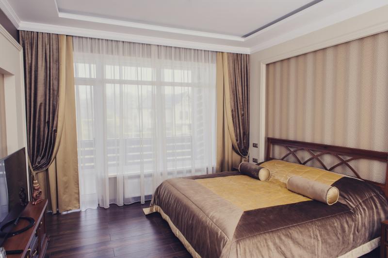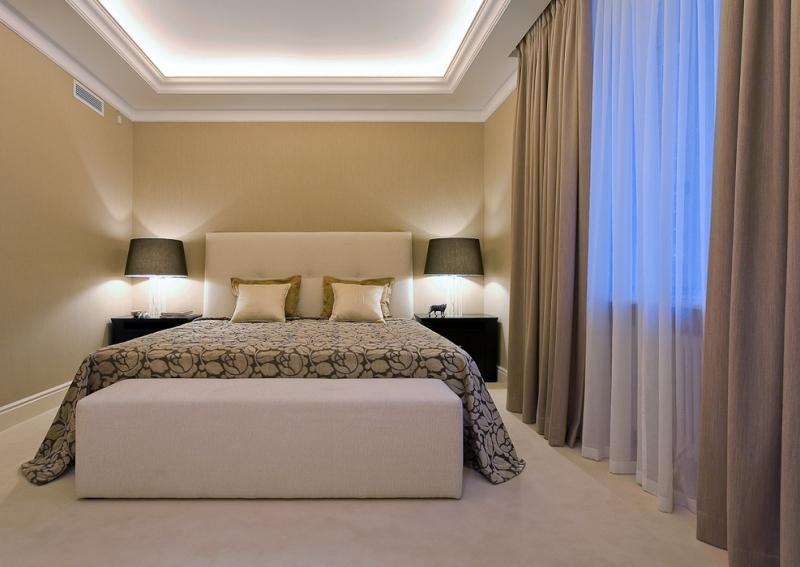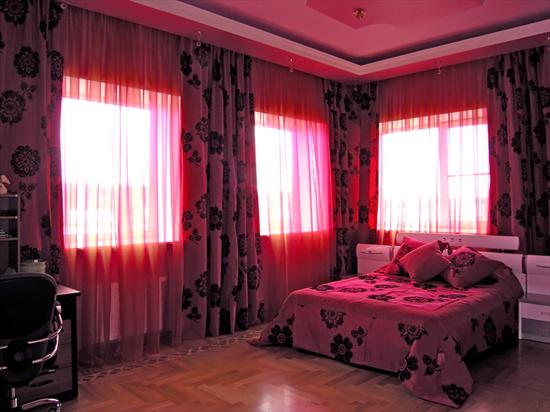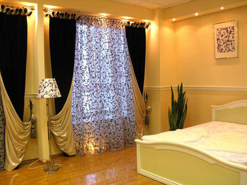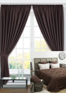 Ein wichtiger Punkt ist der Farbton des Materials. Viele Menschen glauben irrtümlicherweise, dass Nachtvorhänge schwarz sein müssen. Bei der Auswahl eines Farbtons ist es wichtig, die Innenausstattung des Schlafzimmers zu berücksichtigen. Beachten Sie auch den Moment, in dem die Vorhänge 2-3 Töne von der Farbe der Wände abweichen sollten, sonst wird das Gesamtbild verwöhnt.
