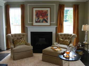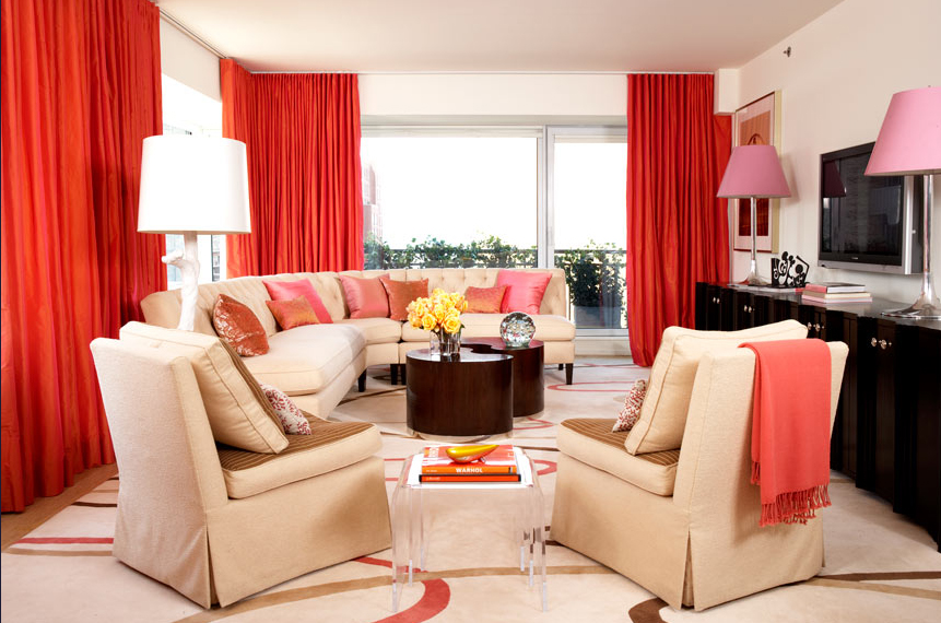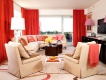 - Rot Diese Farbe wird meistens mit einem weicheren und helleren Ton kombiniert, zum Beispiel beige. Feste rote Vorhänge in dunklen Farben können im Inneren des Wohnzimmers vorhanden sein. Sie können in den Hallen für die Feiern gefunden werden.
