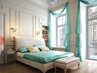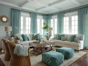 - Türkis. Verschiedene Schattierungen dieser Farbe zieren die Fenster in den Kinderzimmern. Ein weicher Ton ist eine gute Wahl für Schlafzimmer.