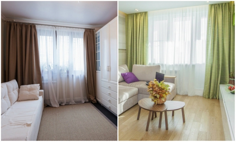 Es ist wichtig, den richtigen Stoff zu wählen, nämlich seine Zusammensetzung, Textur, Dichte und Dicke. Auf der Basis von kompakten Wohnungen müssen Sie sehr sorgfältig die Farbpalette wählen, die einfach und unauffällig aussieht. Designer bemerken, dass die Vorhänge in der gleichen Farbgestaltung sicher in der Dekoration von kleinen Räumen verwendet werden können. Monochrome Modelle eignen sich für die Platzierung in Räumen mit niedrigen Decken und einem Mangel an natürlichenBeleuchtung.