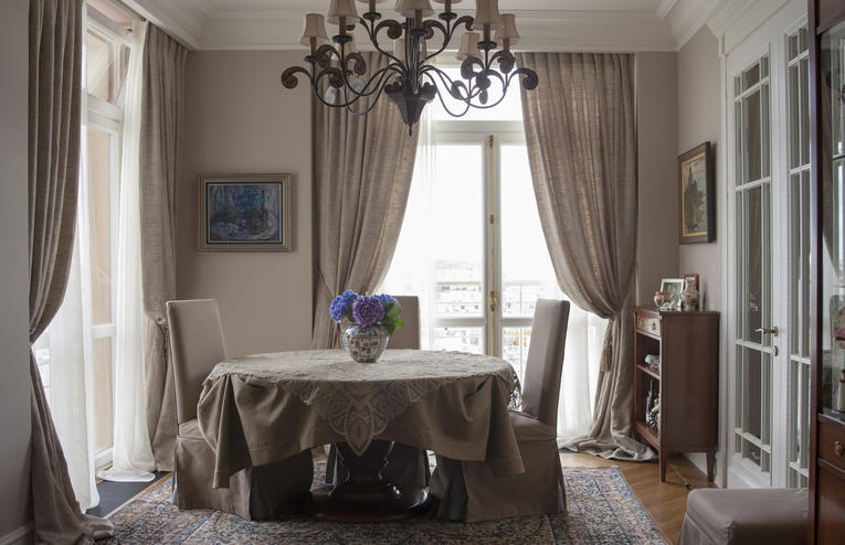 Es wird angenommen, dass Sie für eine luxuriöse und schicke Einrichtung nur dunkle und dicke Vorhänge mit goldenen Mustern, Streifen, Rüschen und großen Mustern wählen müssen. Es ist nicht so. Einfache Vorhänge können auch feierlich und elegant aussehen.