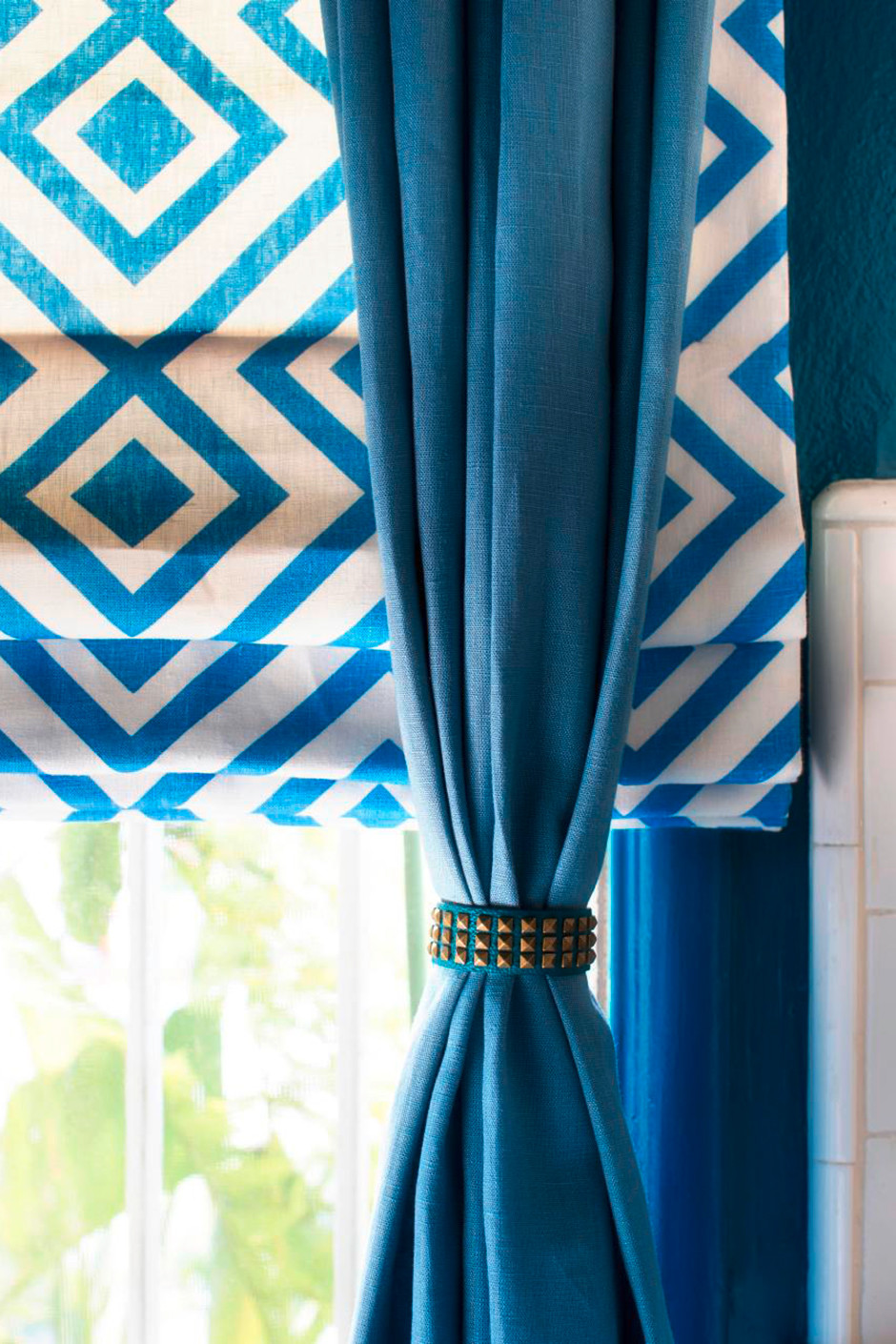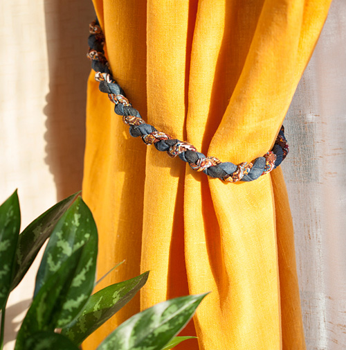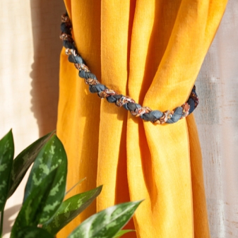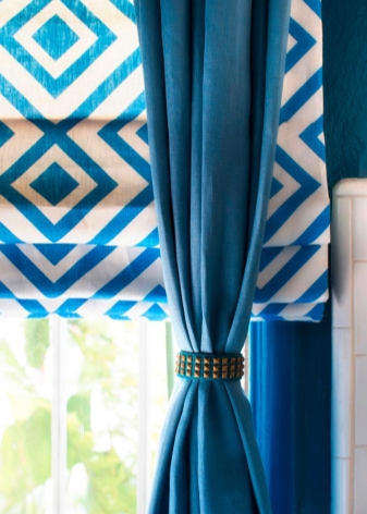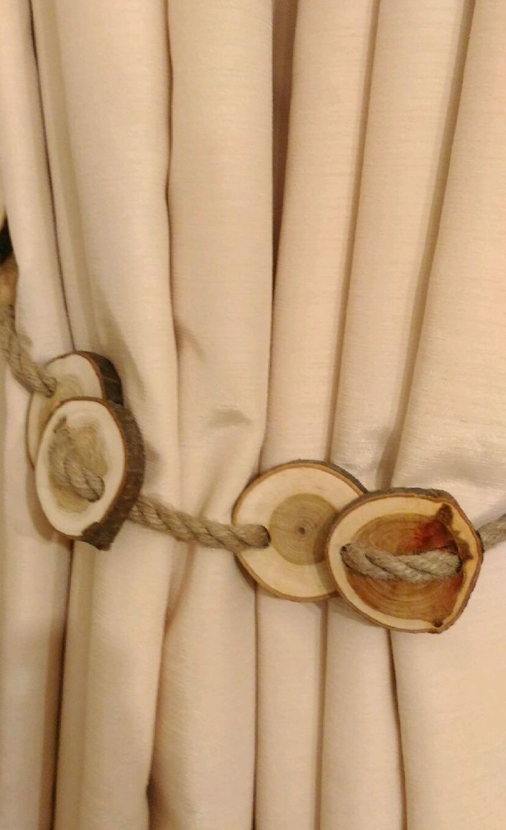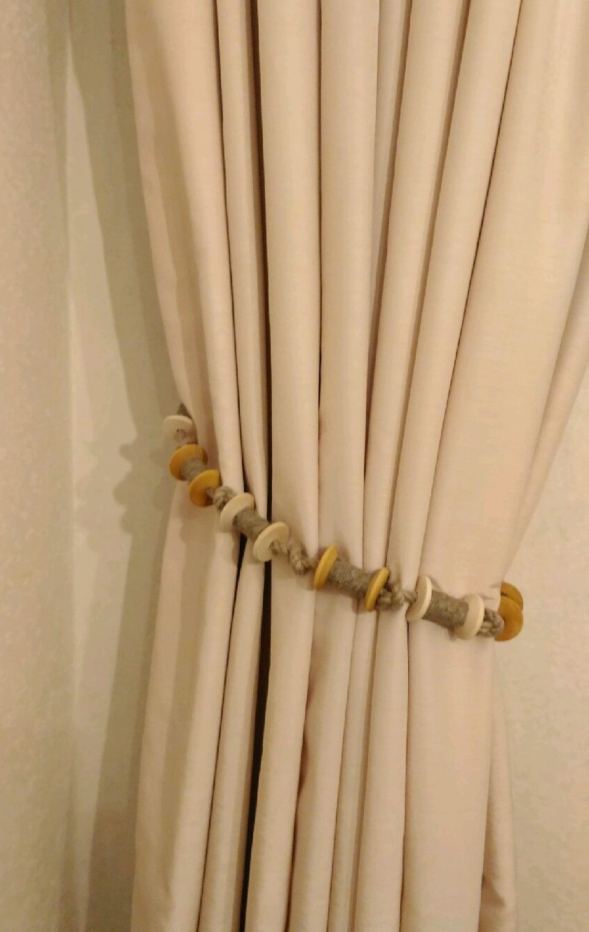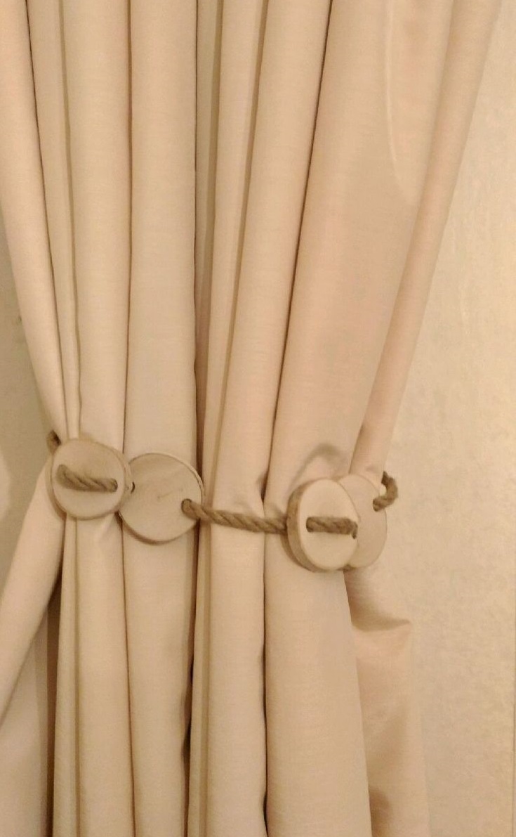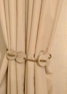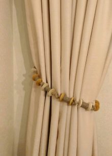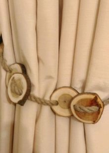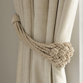 Bindfäden und Seile werden verwendet, um Marine-Stil Pickups zu erstellen. Es sieht wunderschön aus wie ein Pickup, der aus dem gefalteten Seil entsteht und mit einem schlauen Seeknoten verziert ist. Für Eleganz sind Tacks aus Schnüren manchmal mit Goldfarbe getönt. Bürsten, die die Schnüre ergänzen, sollten im gleichen Farbton und aus dem gleichen Material wie die Seile selbst hergestellt werden. Ansonsten sieht die ganze Komposition lächerlich aus.
