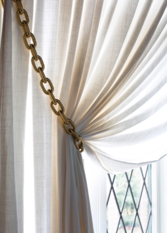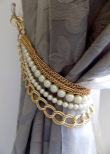 Ein gutes Beispiel für die Verwendung von Schmuck als Reißzwecken.. In diesem Foto dient ein gewöhnliches weibliches Armband als ein Fang. Es ist mit der Verwendung von Metallelementen hergestellt. Es erfrischt das Aussehen von Vorhängen, macht es moderner und dynamischer.