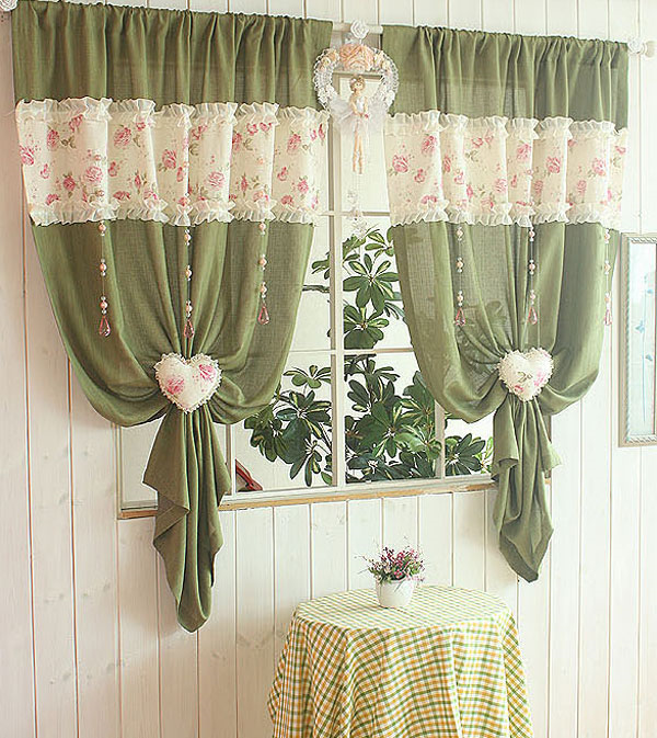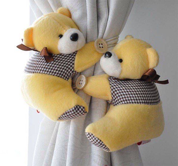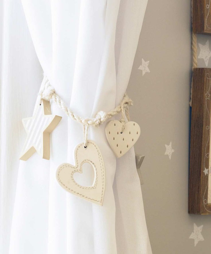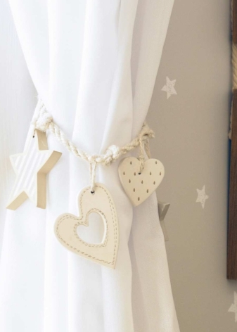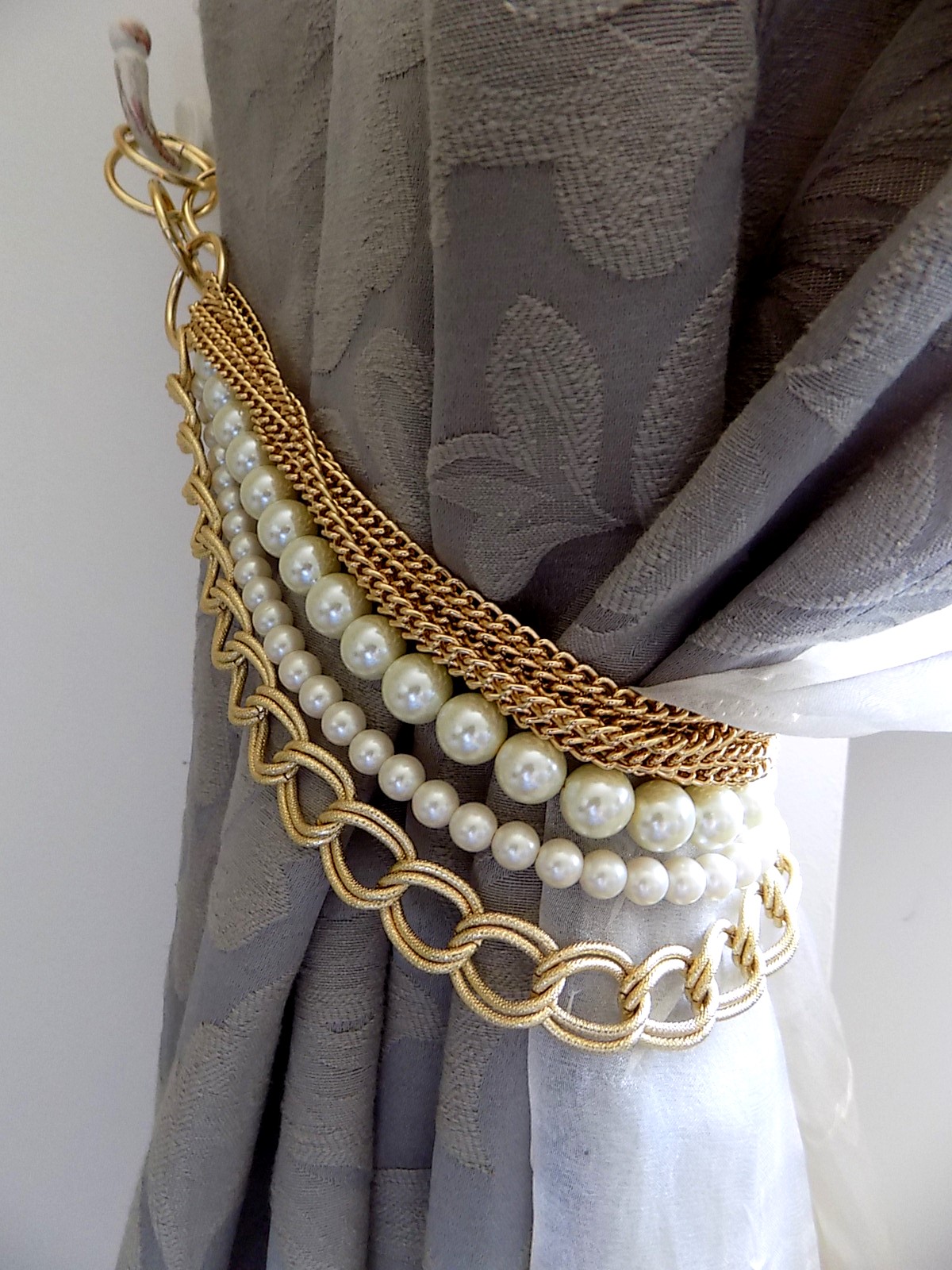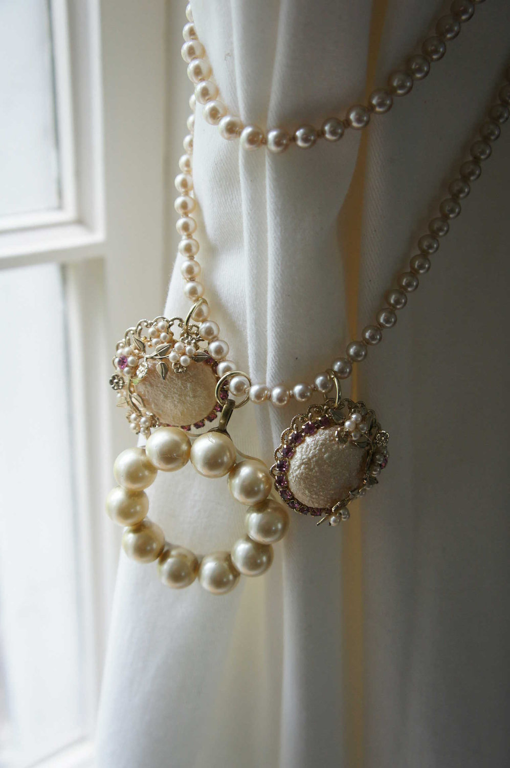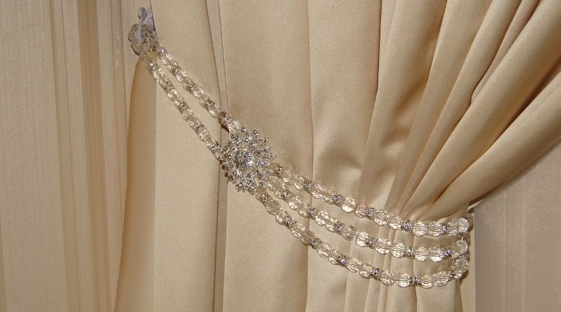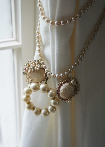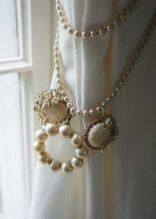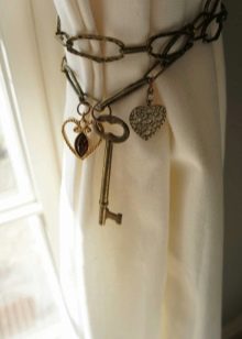 Oft bekommen lästige Perlen ein zweites Leben, wenn Sie die Vorhänge mit ihrer Hilfe aufheben. Die Verwebung von Steinen und Ketten wirkt spektakulär, glamourös und elegant. Die Wahl der Kontrastfarbe der Steine oder der zum Farbton passenden Töne sieht gleich gut aus.Die Verwendung von Medaillons, Ketten, Metallknöpfen passt perfekt in das rustikale "Mädchenhafte" Shabby Chic Stil. Sie sollten diese Art von Nägeln nicht mit dicken Vorhängen verwenden.