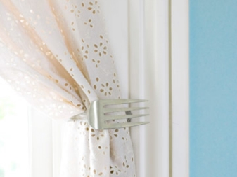 Originalstäbe für Küchenvorhänge können mit einfachen Gabeln und Löffeln hergestellt werden. Es genügt, den Griff nach Bedarf zu biegen, und der Tonabnehmer ist bereit. Eine interessante und mutige Entscheidung wäre die Verwendung einer Tasse. Diese Option ist nur für Lichtvorhänge geeignet.