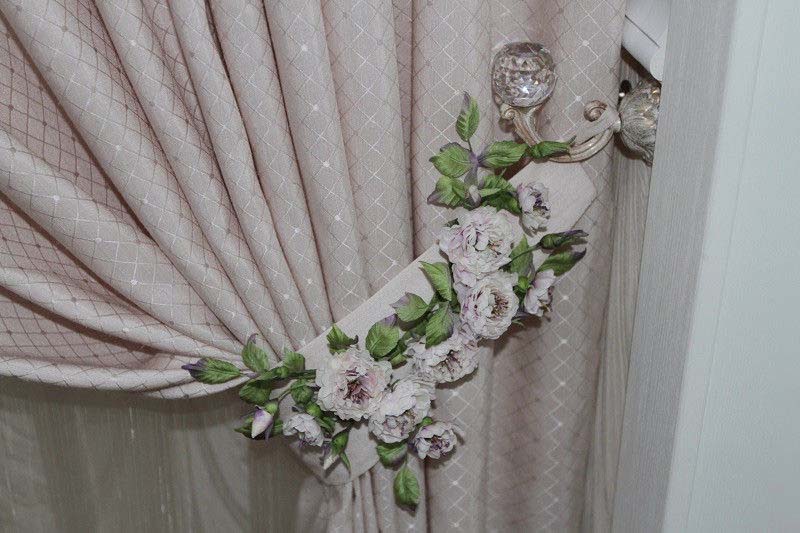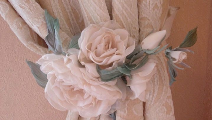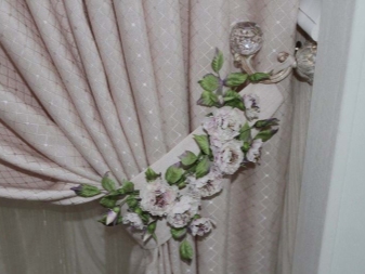 Halter mit Blumen sehen romantisch und sanft aus. Sie bestehen aus künstlichen Blumen oder aus Foamiran, die mit einem unauffälligen Zopf zusammengehalten werden, oder sie nähen Blumen auf einem Stoff-Pick-up. Für hellen Tüll passt die erste Option, während für schwere Vorhänge die zweite Methode geeignet ist.