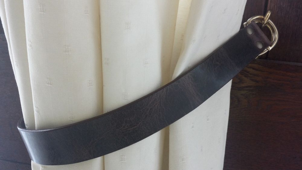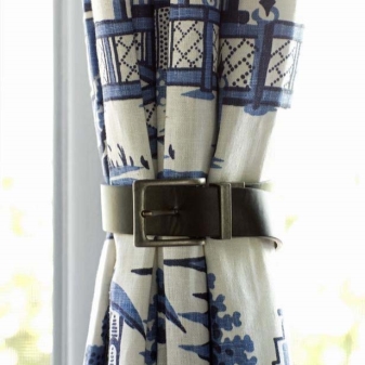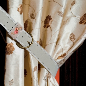 Echtes Leder oder Kunstleder - eines der möglichen Materialien für die Herstellung von Reißzwecken. Eine reiche Auswahl an Farben und Texturen ermöglicht es, dass die Fantasie sich bewegt. Der Vorteil der Haut gegenüber dem üblichen Stoff ist seine Stärke. Ein eher dünner und unauffälliger Leder-Pickup hält einem eher beeindruckenden Gewicht der Vorhänge stand.