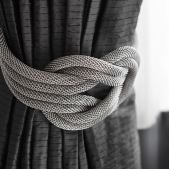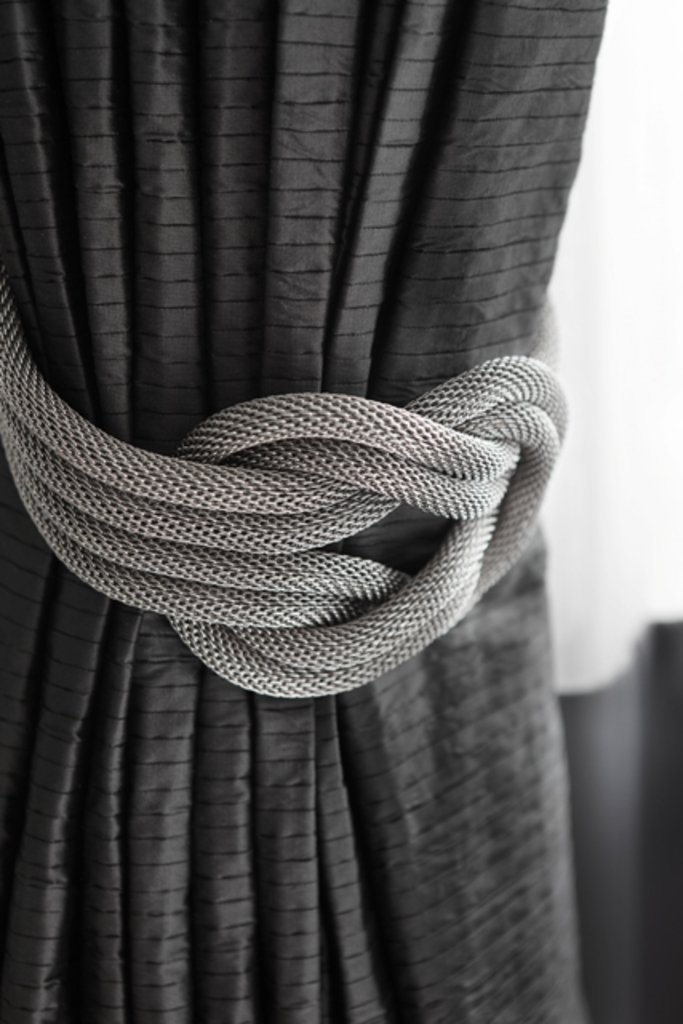 Dasselbe kann über Kabel gesagt werden. Die Seilfestigkeit wird einem Lederprodukt trotz der Tatsache, dass es ziemlich dünn ist, nicht nachgeben. Wenn Sie eine teure Option mit einem dichten Gewebe wählen, können Sie nicht befürchten, dass sich die schwere Struktur auflöst; Dünne Strickmodelle ergänzen die Vorhänge perfekt.