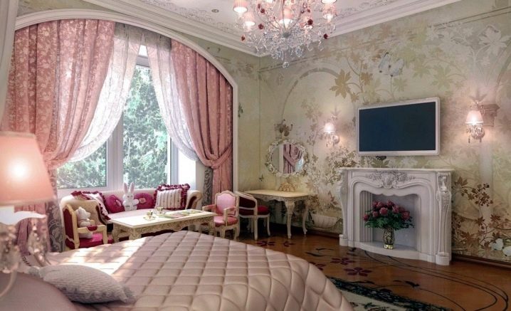 Solche ungewöhnlichen Vorhänge mit einem Gefälle erfordern das gleiche ungewöhnliche Design.. Vergoldete Halterungen in Form von durchbrochenen Ketten haben diese Rolle perfekt bewältigt. Sie überschatteten gleichzeitig nicht die Schönheit der Vorhänge und waren nicht auf ihrem Hintergrund verloren.Eine harmonisch gewählte Anordnung an der Kreuzung der Farben lässt das eigentümliche Muster auf den Vorhängen tiefer und reicher erscheinen.