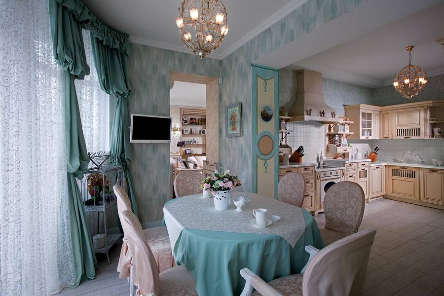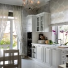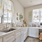 In diesem Stil der Farbe sollte daher Zärtlichkeit und Weichheit bedeuten kaltem weißen Tüll ist besser, Milch oder Elfenbein zu ersetzen, die viel spektakulärer und atmosphärischer aussehen wird. Wie für die Vorhänge geeignet, die "Café" kurze Vorhänge werden gleich gut aussehen, und cremefarben oder hellblaue Vorhänge mit einem Blumenmuster und blassem Gold mit einem Fransen werden den Boden erreichen.