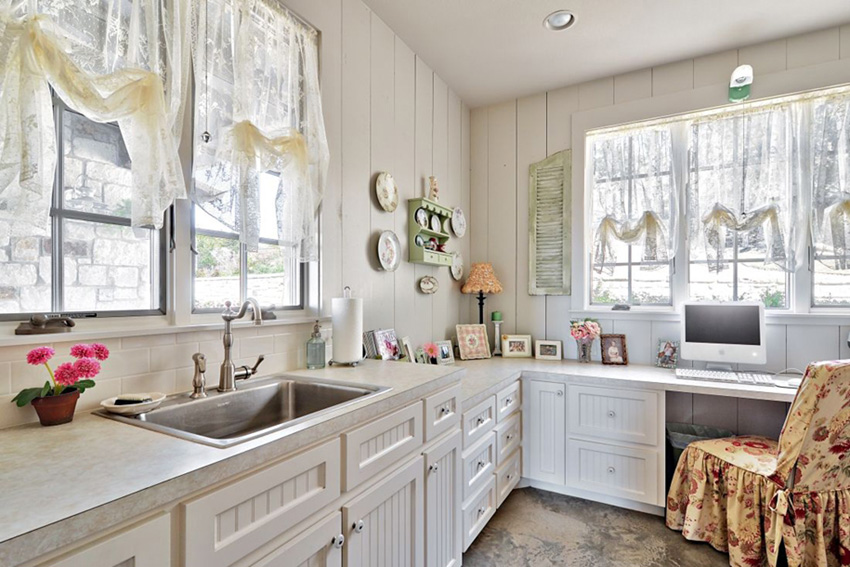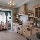 Dieser Stil hat natürliche Farben - grün, braun, Terrakotta, Sand. Die Farben der verwendeten Stoffe sollten hell und fröhlich sein, während dunkle Farben vermieden werden sollten. Sehr geeignet in der Küche, im Stil des Landes gemacht, wird aussehen milchig-durchscheinende Vorhänge im Tandem mit Gardinen in den Erbsen, bis zur Mitte des Fensters reichend oder mit einer Bordüre verziert.