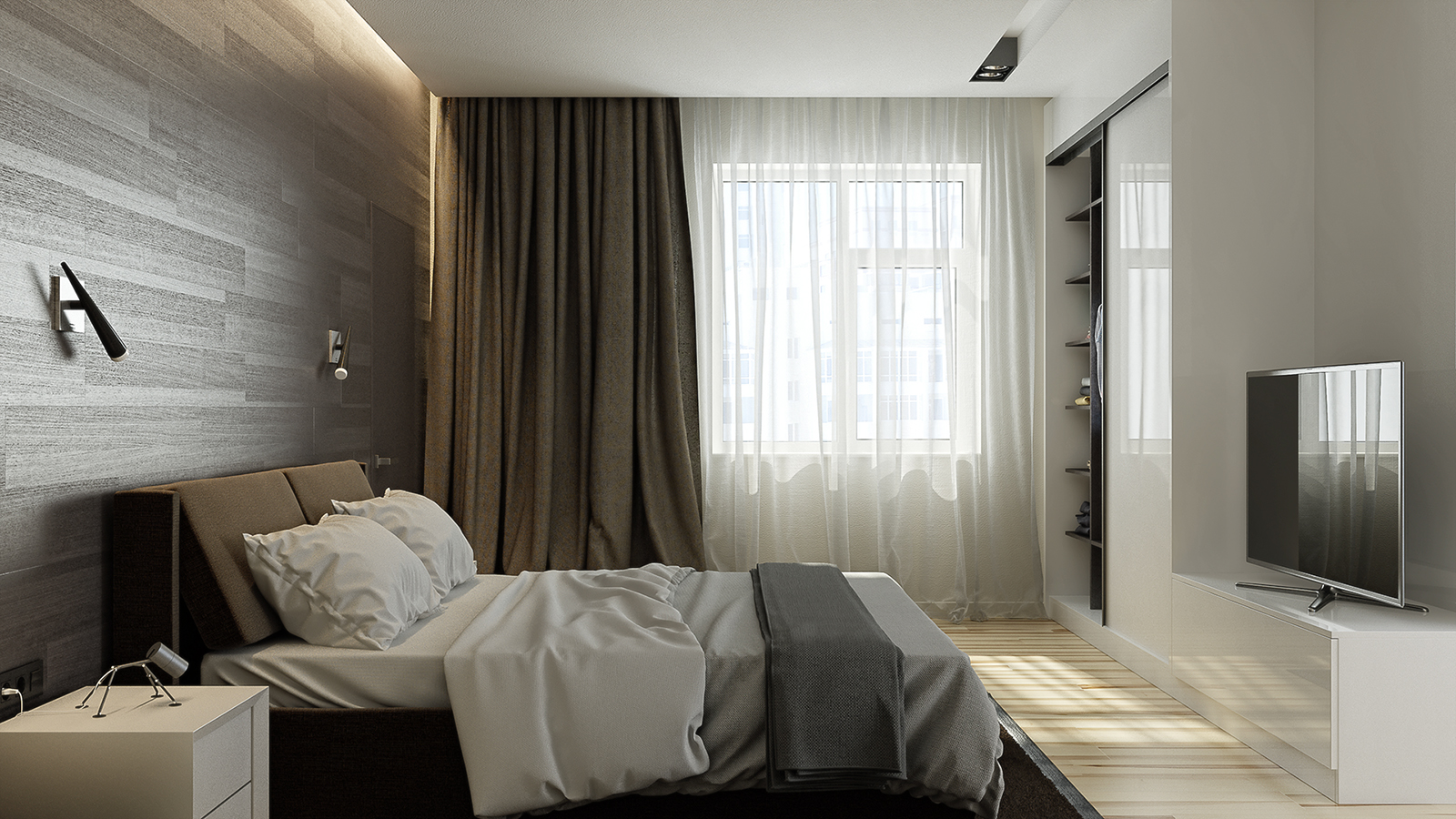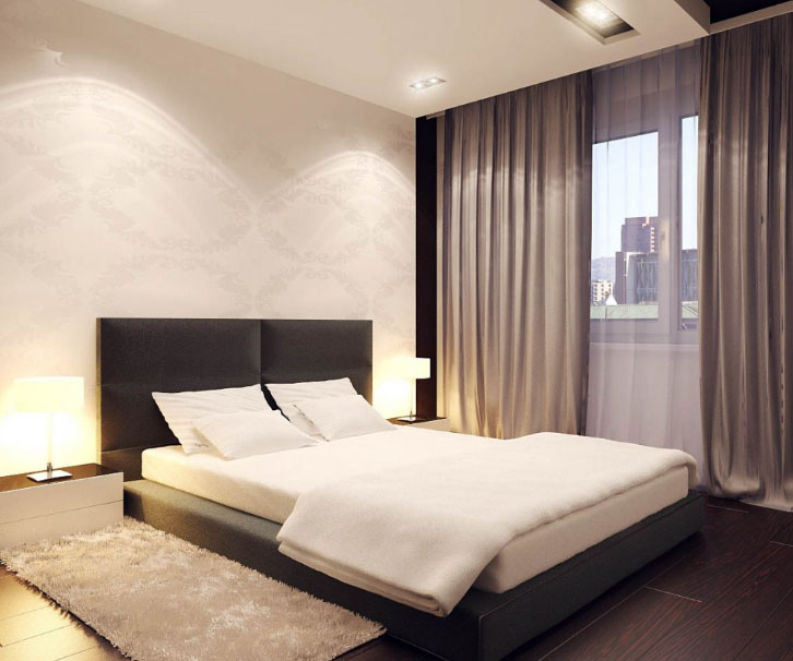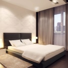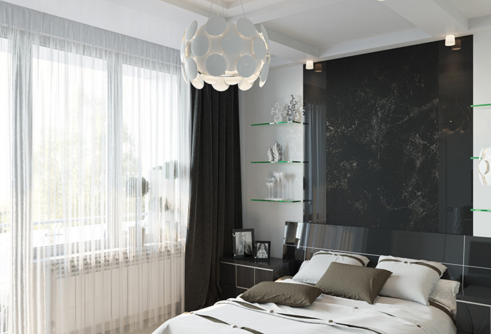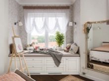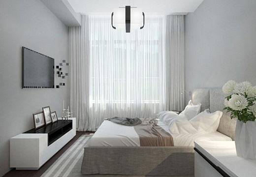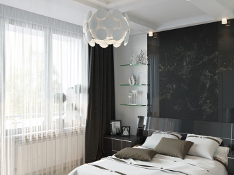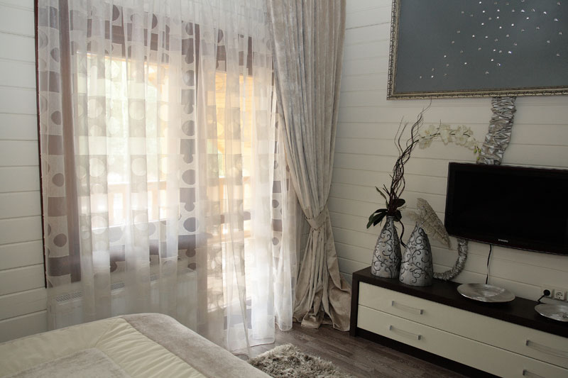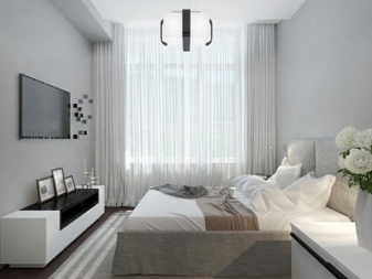 Diese Option ist besonders gut für das Schlafzimmer - Tüll verbreitet das Sonnenlicht gut, was es ermöglicht, den Raum gut zu beleuchten und gleichzeitig direkte Blendungsstrahlen zu vermeiden.Die Opazität von weißem Tüll ist auch wichtig für ein Zimmer zum Schlafen und Entspannen.
