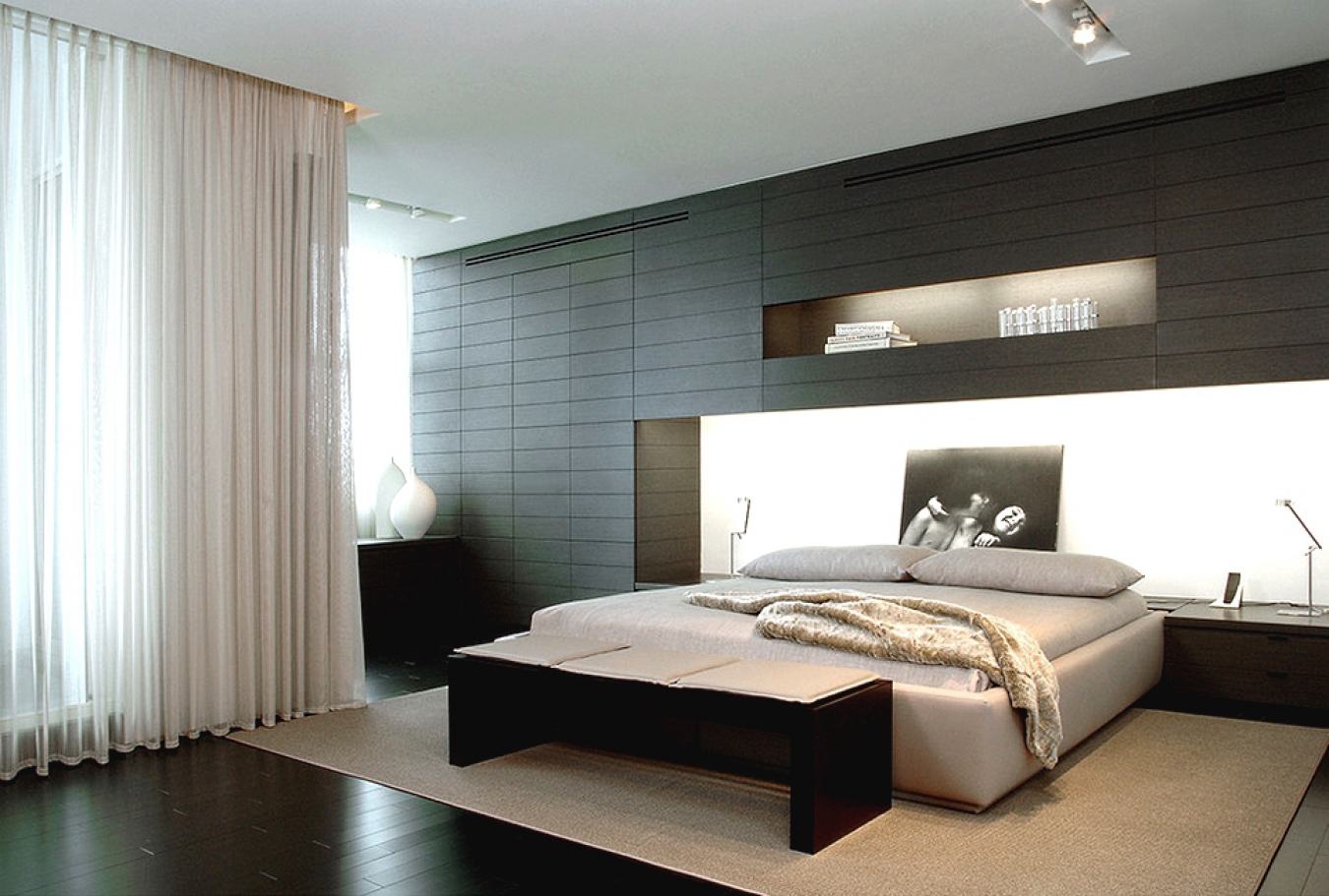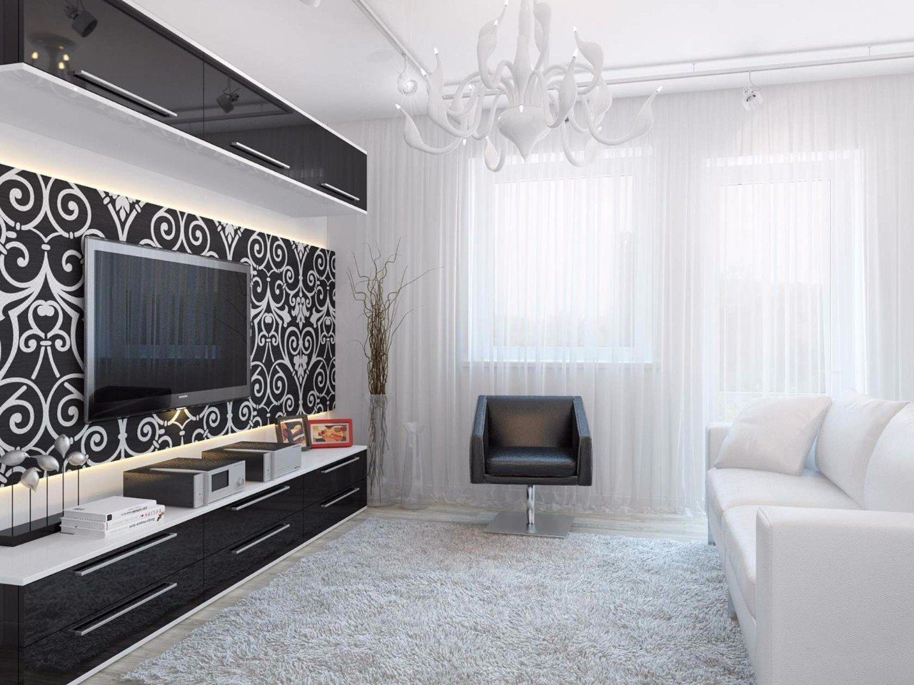 Schlichte weiße Vorhänge sind eine gute Ergänzung zu den klassischen schwarzen und roten Vorhängen mit Silber im japanischen Stil. Am Nachmittag wird es in einem solchen Raum hell und sonnig sein, und nachts wird es möglich sein, eine Atmosphäre von Gemütlichkeit und Einsamkeit zu regieren.