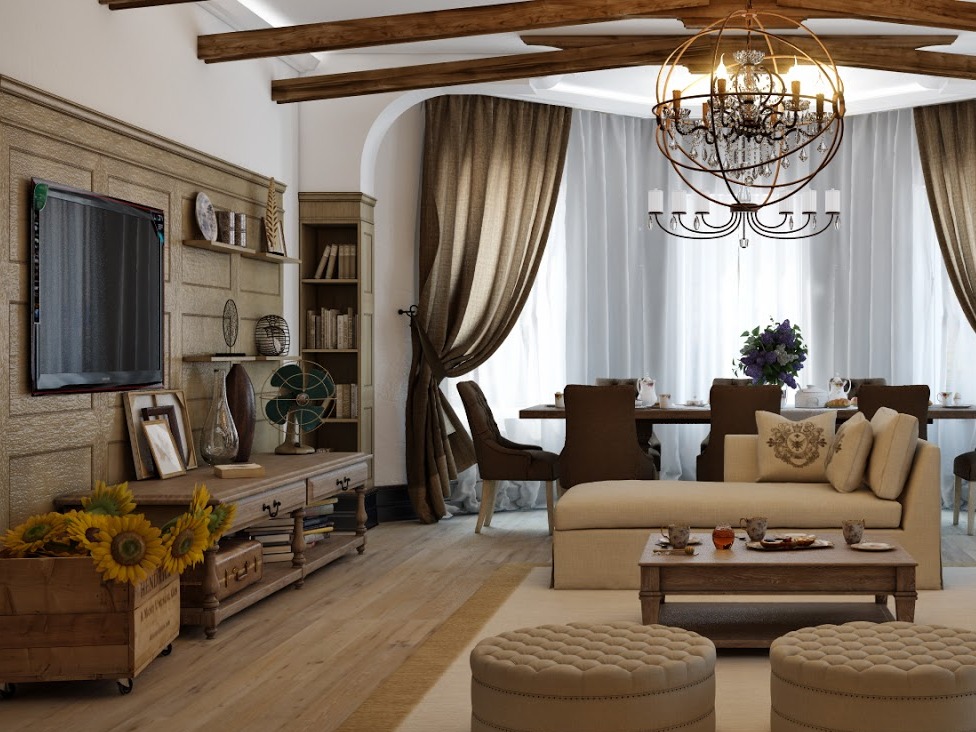 Ein Stil, der es ermöglicht, in den Charme der Natur einzutauchen, um im Raum eine besondere Atmosphäre von Wärme und Komfort zu schaffen. Natürlichkeit - das ist sein Hauptprinzip, der Wunsch, den ganzen Charme des Vorstadtlebens in eine Wohnung zu übertragen, die sich sogar im Zentrum der Metropole befindet.