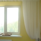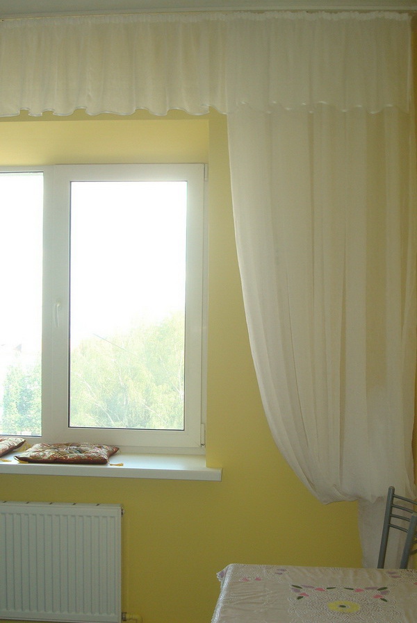 Das asymmetrische Aufhängen von Tüll wirkt originell. Vorhänge auf der einen Seite des Fensters, die sanft herunterhängen, geben dem Raum Eleganz und Anmut. Tüll mit der Montage muss nicht im Boden sein - eine Kurzfassung kann durchaus zu einem eigenständigen Fensterdekor werden. Asymmetrisch angeordnete Luftschleier verzögern das Tageslicht nicht. Außerdem können Sie immer ein zusätzliches Rollo verwenden. Diese Option eignet sich gut für das Küchenfenster aus Kunststoff und für das Fenster im Schlafzimmer. Es ist besser, einen Vorhang zu wählen, der zu den Wänden passt und gleichzeitig den Effekt des dreidimensionalen Raums erzielt. Ideal ist in diesem Fall die Verwendung von Pastelltönen.