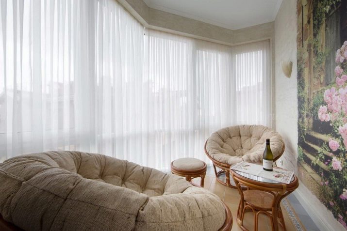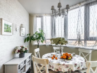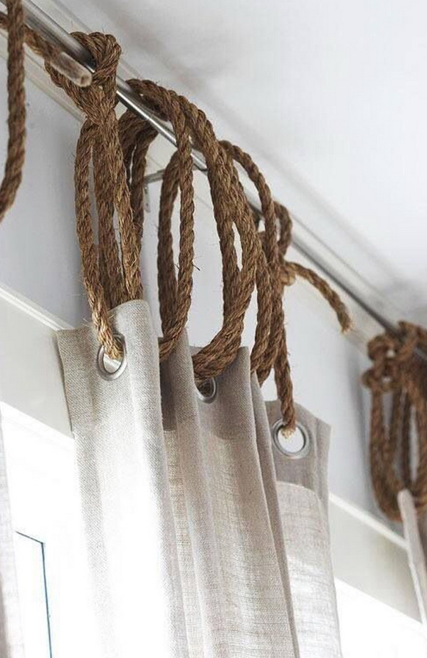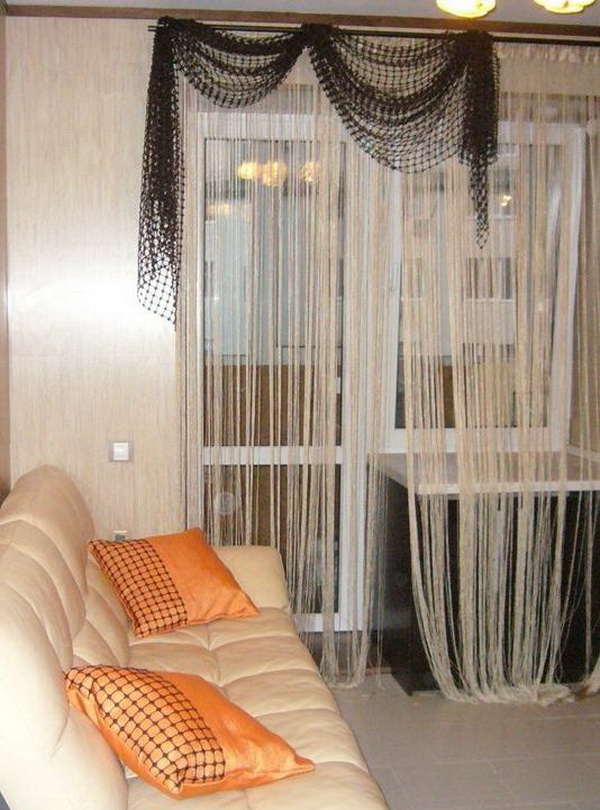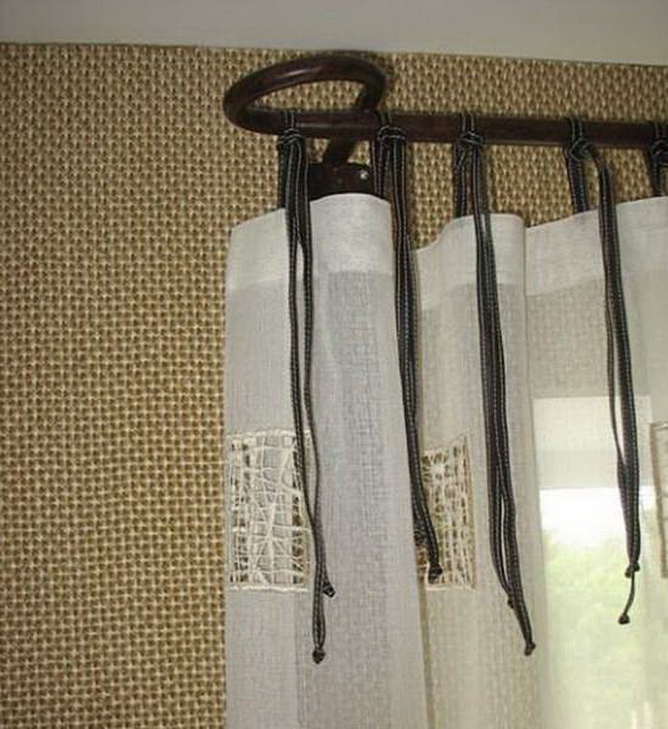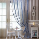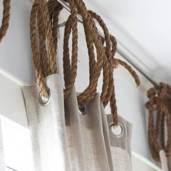 Für Stil Loft, marine Thema, können Sie die Methode der Befestigung Tüll ohne Vorhänge verwenden. Haken und Ringe werden parallel zum Boden über dem Fenster eingefügt, eine dekorative Schnur wird durch sie hindurchgeführt. Der Stoff wird darauf fixiert.