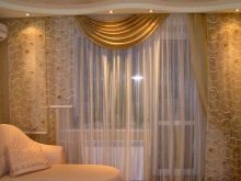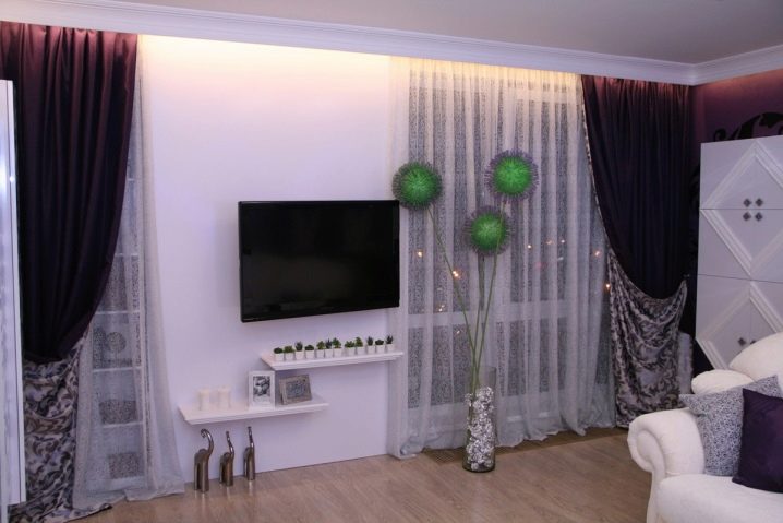 Das mehrstufige Arrangement aus Tüll wird eine echte Dekoration sein. Dieses Dekor wird am besten in der Halle oder im Wohnzimmer angewendet. Es ist interessant, Stoffe mit verschiedenen Texturen und Schattierungen derselben Farbe übereinander zu legen. Neben Drapierung, ungewöhnliche Clips, die Schönheit des Inneren wird die Zusammensetzung von Tüll, mit Fransen, Bändern, Strass verziert.